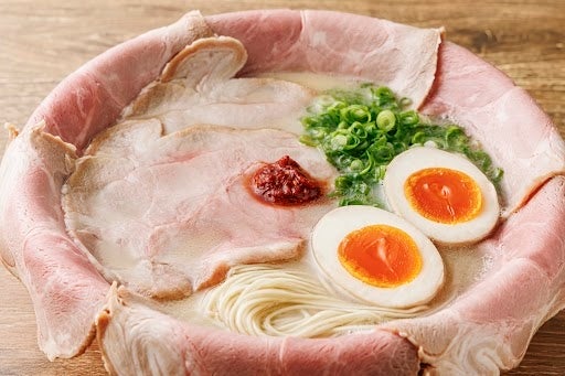 醤油麹に一晩漬け込んだ豚肩ロースをしっとりと仕上げた自慢のチャーシュー。丼から溢れ出す程贅沢にトッピングした自慢の一杯です。もちろんスープはトンコツ発祥の地で長年愛されているお墨付き。特注の極細麺との相性もバッチリです。真っ赤な特製薬味ダレを溶かしながら、極上トンコツの世界へ「いってらっしゃい!」