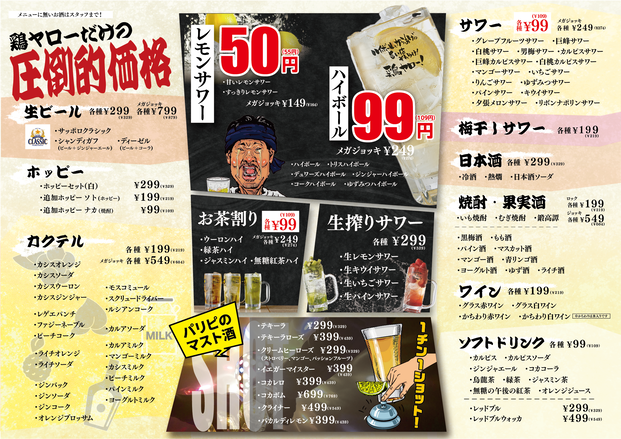 50円のレモンサワーを筆頭に、サワーやハイボールが99円という信じられないような価格。圧倒的なドリンクメニューの安さと、バラエティに富んだフードメニューが魅⼒の居酒屋です。
