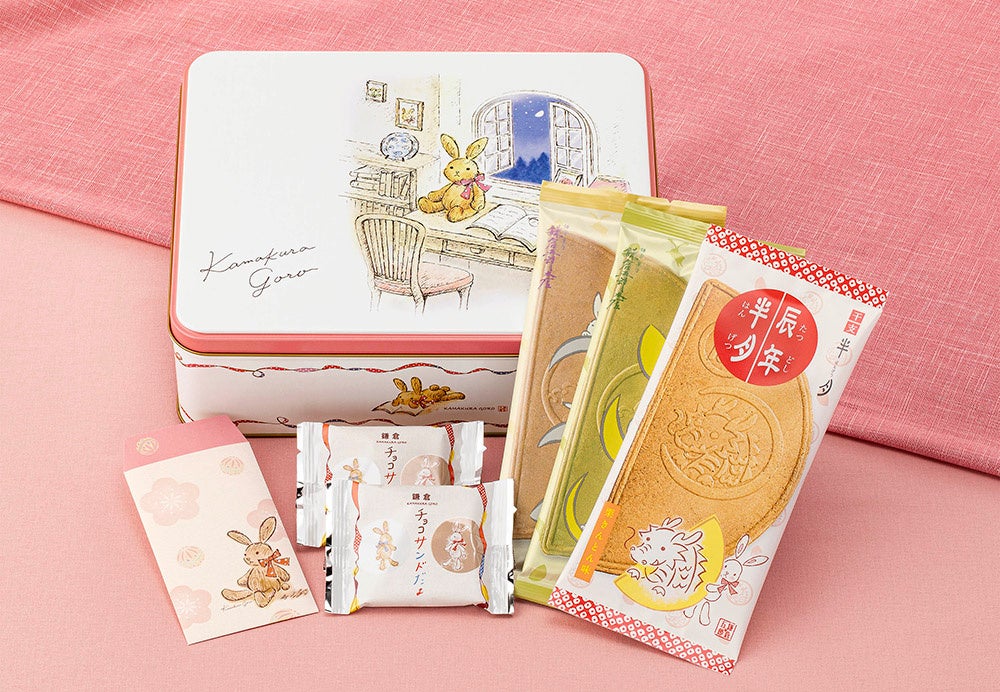 【内 容】鎌倉半月(抹茶風味 3枚、小倉風味 3枚)、辰年半月[栗きんとん味]3枚、鎌倉チョコサンドだょ 4個、うさいちご 1袋 ※ポチ袋(5枚)入