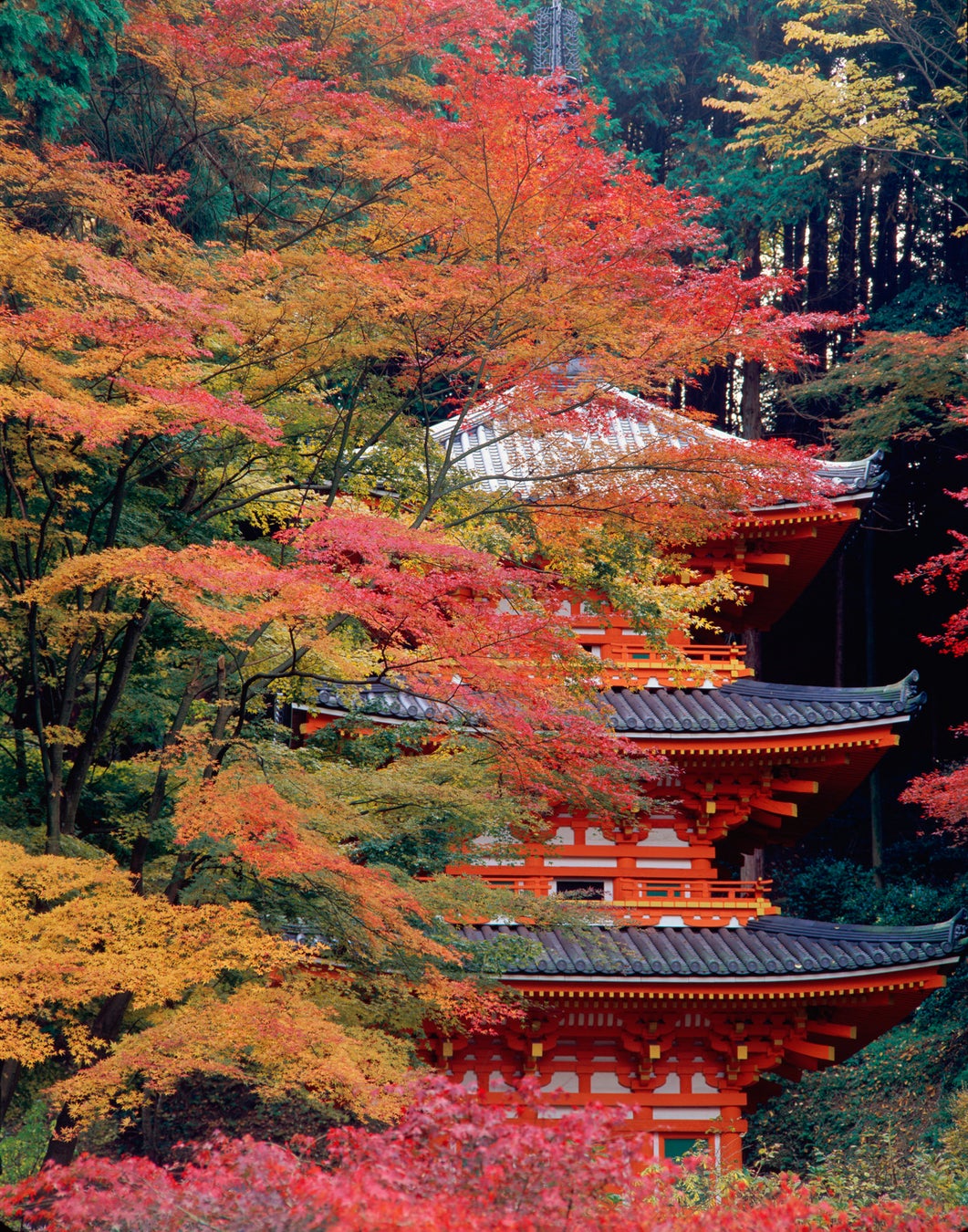 朝日を受けて映える三重塔は、紅葉と合わさり神秘的な空間になります。
