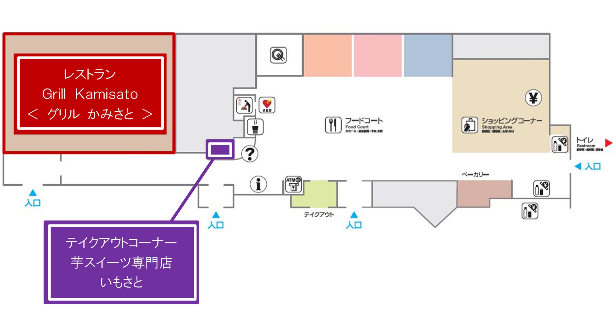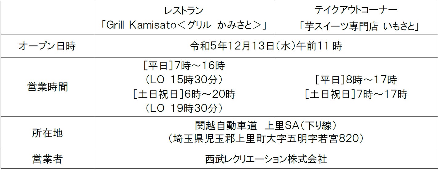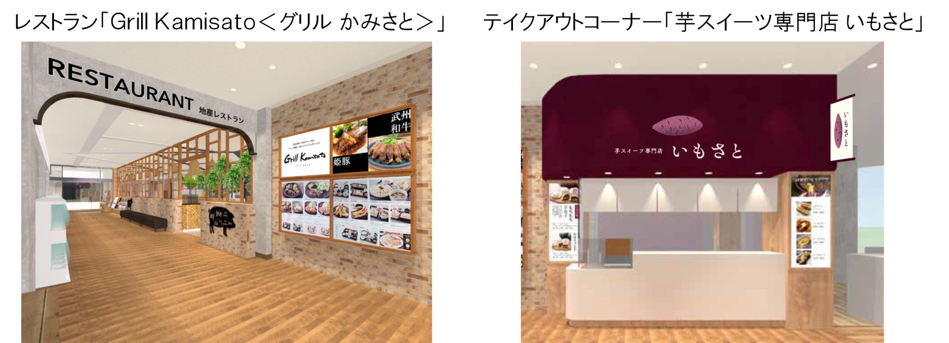 「Grill Kamisato<グリル かみさと>」では、埼玉ご当地ブランド肉の武州和牛と姫豚を使用したグリル料理をメインとしたプレミアムなメニューを提供します。「芋スイーツ専門店 いもさと」では、看板商品の「もちもち芋万十」をはじめ、お客さまの目の前で仕上げる「お芋づくしもんぶらん」等、お芋好きにはたまらないスイーツを販売します。