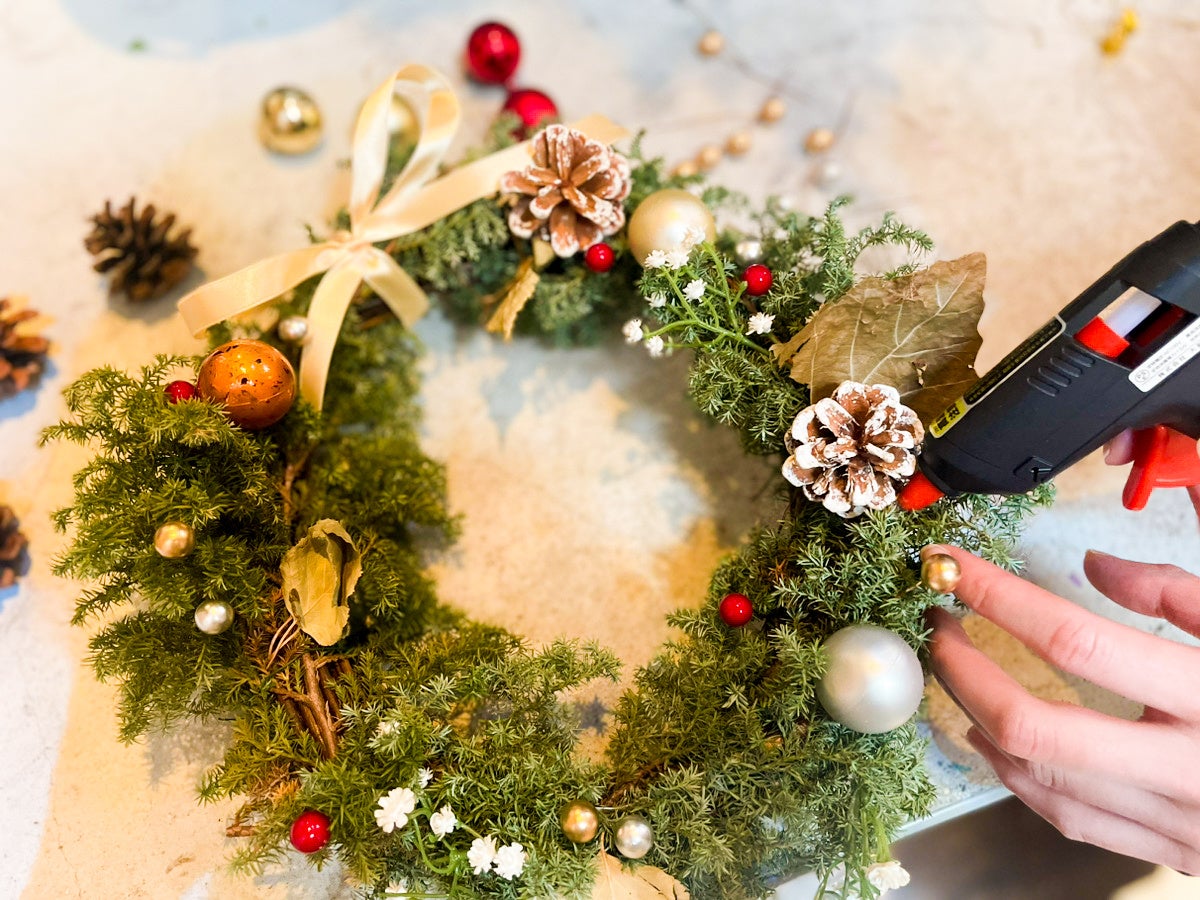 松ぼっくりやオーナメント、もみの木、ドライフラワーなどたくさんの材料を用意したリース作りワークショップ。世界に一つだけのオリジナルリースを作ってお家にクリスマス気分を持ち帰ってみては?
