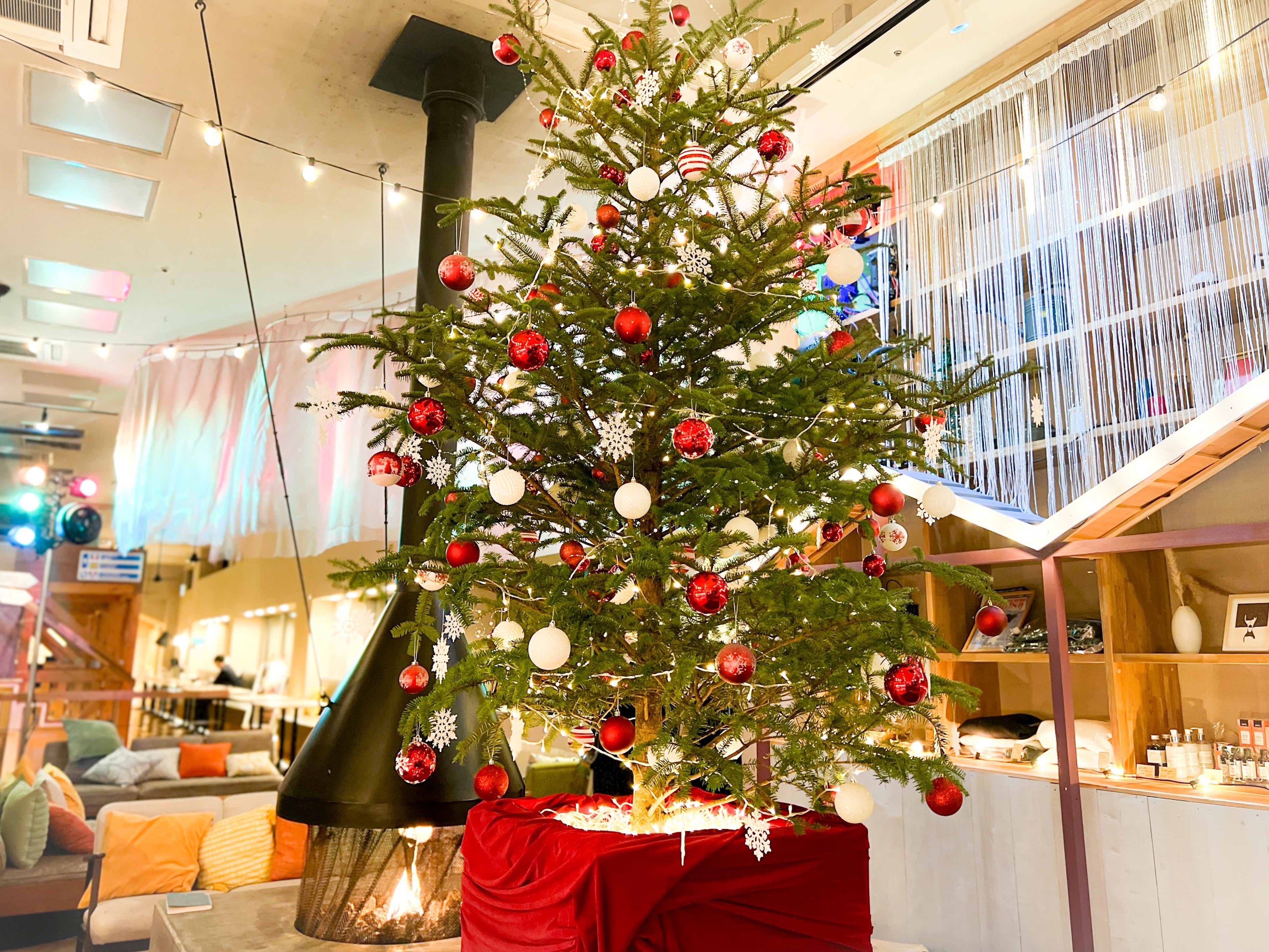 暖炉前のラウンジには冬シーズン限定で本物の巨大もみの木が登場! キラキラ光るイルミネーションや可愛いオーナメントにも注目を。