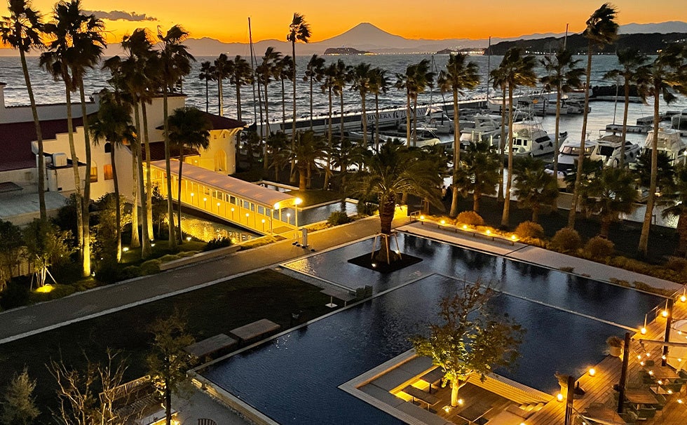 全11室が50㎡以上のオールスイートの客室から海を望む富士山ビュー『マリブホテル』の宿泊に、リストランテAOの特別クリスマスコースをディナーでお愉しみいただける、特別な日をゆったりと過ごせる宿泊プランをご用意。客室ごとに異なる眺望とスタイルの違う上質な空間では、「何もしない贅沢な時間」を味わえます。ヤシ並木や富士山、マリーナを望むオーシャンビューの客室で、刻々と移り変わる幻想的なサンセットと心地良い波音を聞きながら、おふたりだけの時間をお過ごしいただけます。特別な1日を非日常空間でご堪能ください。