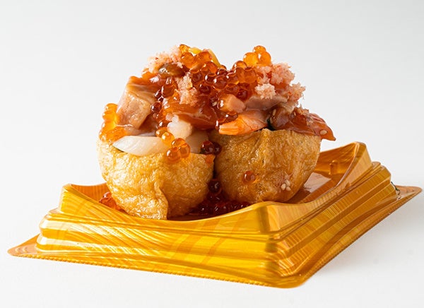●「こぼれ北海三昧」税込1,728円(2貫)/おいなりさんの上に、いくら、サーモン、ほたて、カニ身、海老、とびこ、大葉、上から柚子。※12月6日(水)~期間限定販売。