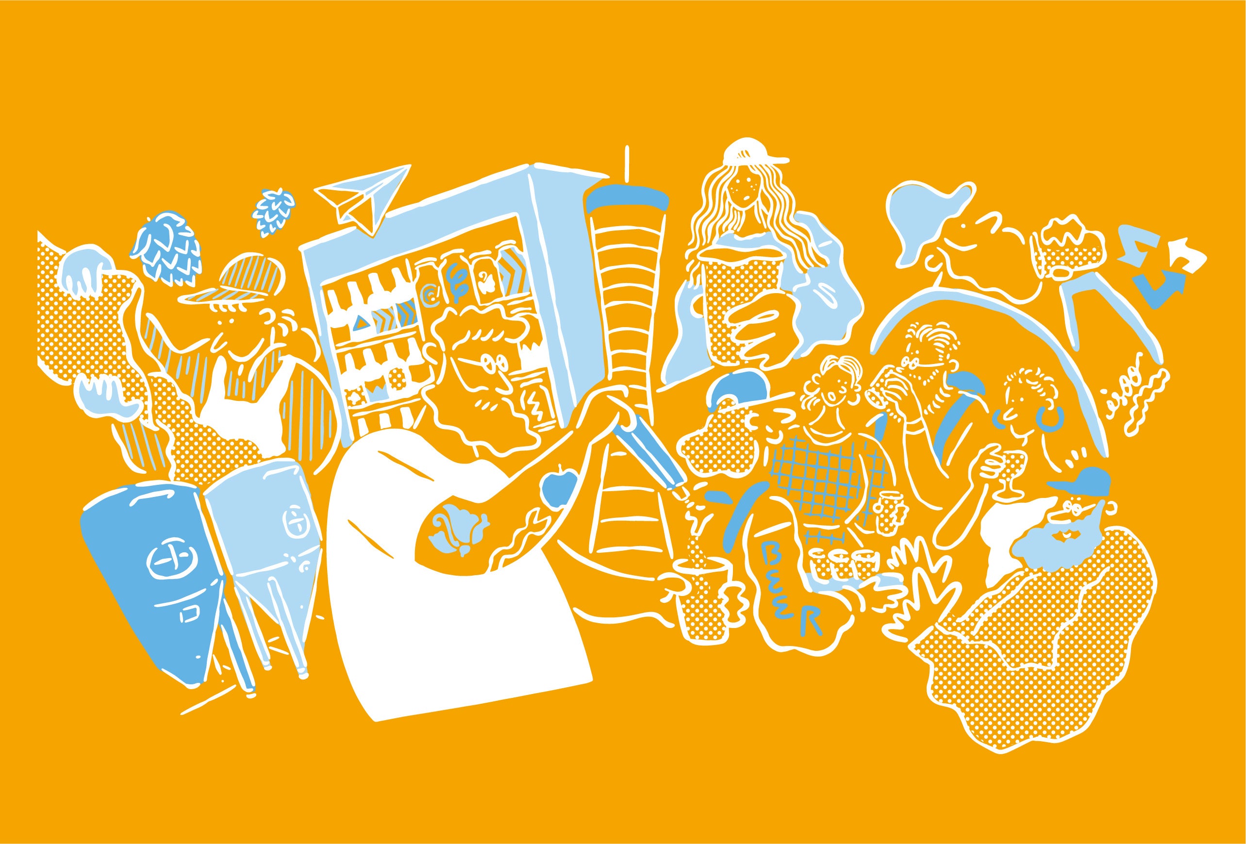 中央には神戸をイメージしたモチーフや、当イベントの主役でもある「売り手」が描かれています。左右にはそれぞれ「造り手」と「飲み手」をデザインすることで、ビールに関わる人々を表現しています。
