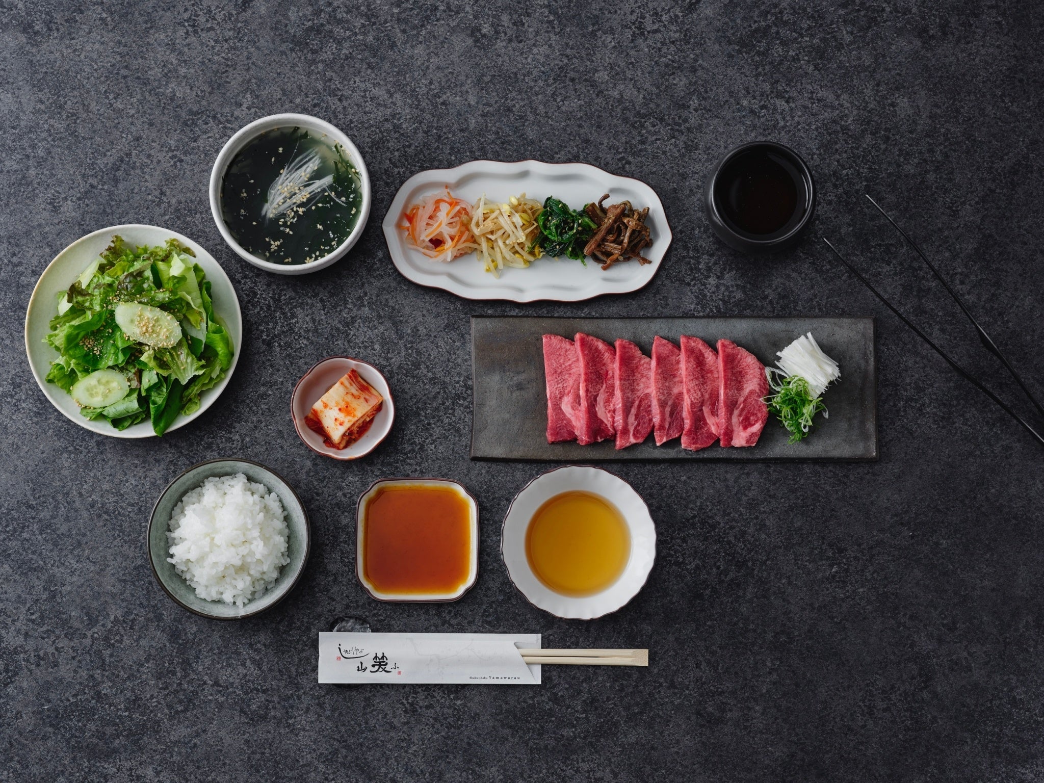 「やきにく山笑ふ」は、国内に3店舗を構え“一人一鍋”を提案しているしゃぶしゃぶ専門店「しゃぶしゃぶ 山笑ふ」を継承し、カウンター席では“一人一台の無煙ロースター”をご用意しています。テーブル席は、2名以上でのお食事もお楽しみいただけます。春をあらわす季語である、店名の「山笑ふ」は、ふつふつとたぎりながら芽吹く様子を表現しています。曲線を描いたやさしいデザインが特徴の内装は、自然のあたたかみを感じられる木材を取り入れつつ、落ち着いた色味で統一することにより心地のよい空間を演出しています。お料理は全ての食材にこだわり、厳選された産地のお肉と季節にあわせたお野菜を堪能できます。美味しい炊き立てのお米を召し上がっていただきたく、釜炊きご飯をご提供します。直火で一気に過熱することで、お米一粒一粒が立ち、ご飯の甘味、粘り、香りが引き立ちます。