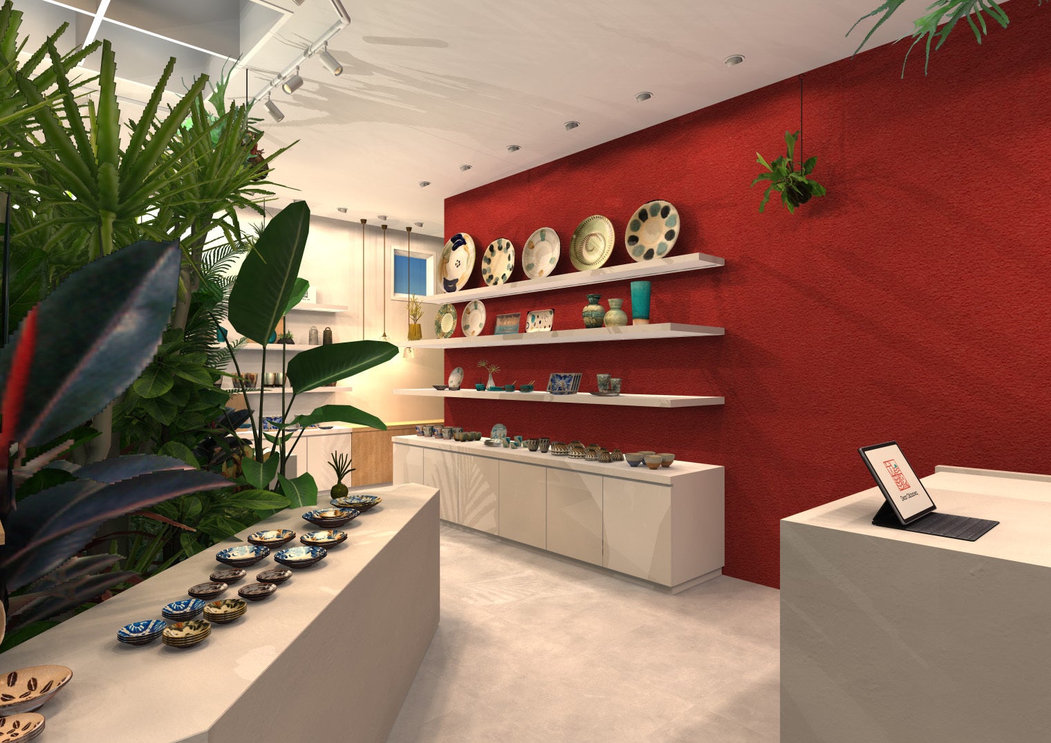 店内中央には、グリーンコーディネーター新城圭吾氏(PLANTADOR)監修による、オオタニワタリなど沖縄らしい観葉植物の生木を植えた箱庭を配置し、沖縄ならではの多様で豊かな自然を表現しています。さらに、箱庭を囲むように配置された商品棚には、草花や海をモチーフにしたやちむんや琉球ガラスなどをはじめとする、沖縄の自然と深い結びつきを持つ工芸品がディスプレイされています。