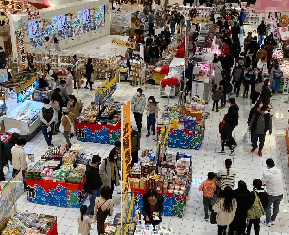 「北海道物産」は北海道土産定番のお菓子に加え、オホーツク海で育ったしっかりと脂がのった肉厚な“ホッケ”や”いくら”などのグルメコーナーを充実させ展開します。
