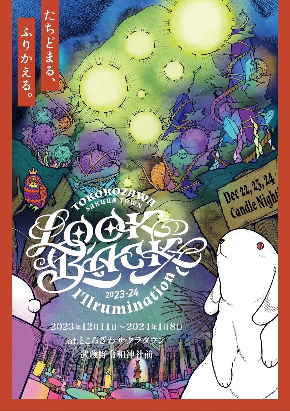 まずは12月1日(金)からシンボルツリー高野槇(コウヤマキ)と水盤エリアのライトアップを開始し、12月11日(月)からは所沢夏の風物詩として定着している「所澤 神明宵の市」を手掛ける角田テルノ氏プロデュースのもと「Look back I‘llrumination」(I‘llruminationは“I will rumination(反芻する)”の造語)をテーマタイトルとして5組のアーティストがテーマタイトルからインスピレーションされた作品を制作・展示した装飾とデコレーションを演出します。