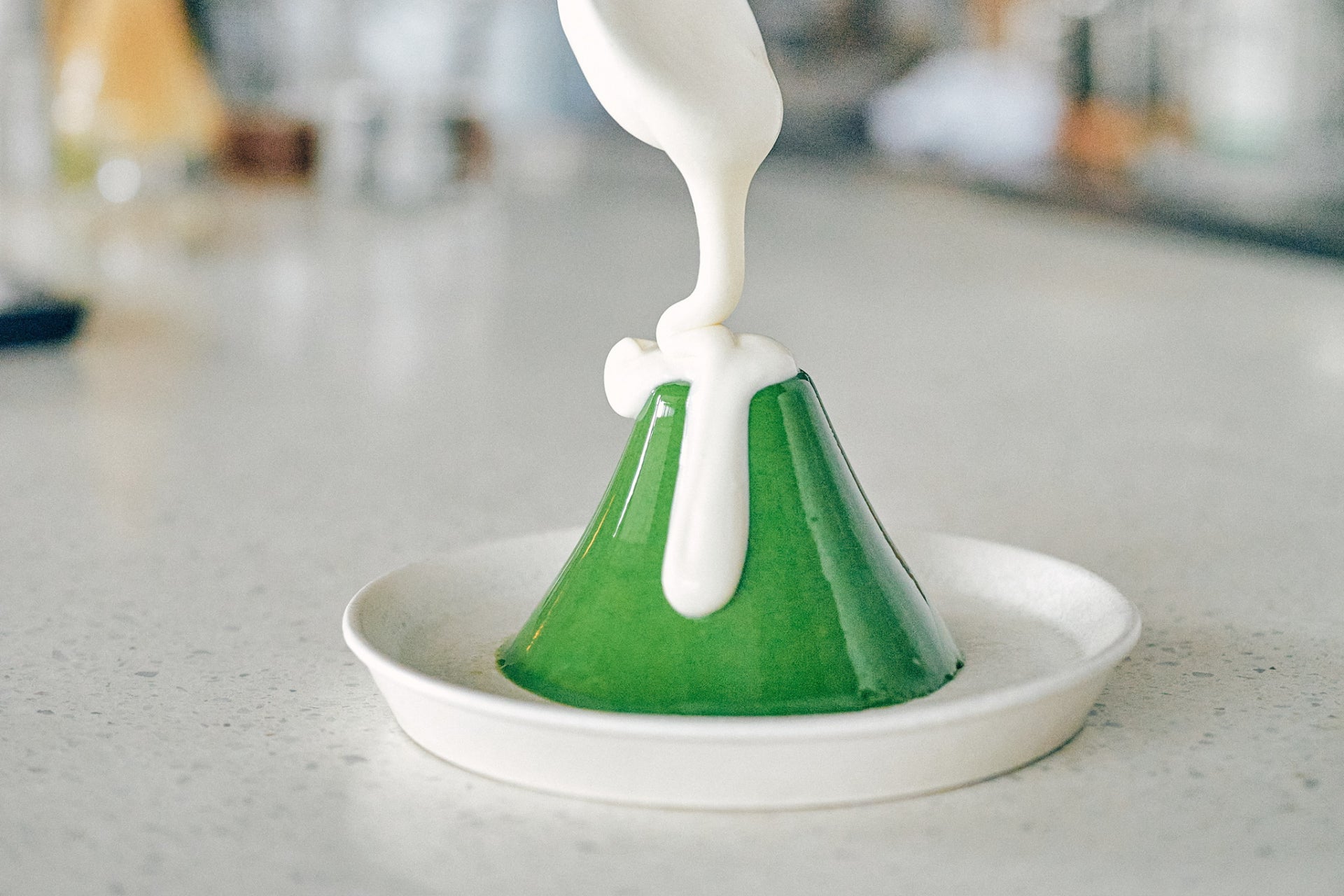 ”富士抹茶”使用の抹茶プリンにマスカルポーネクリームをかけた静岡ならではの富士山形のプリンです。自家製プリンに、クリームを目の前でかけて仕上げていきます。プリンには、抹茶をたっぷり練り込んでいるため、抹茶の味わいが口いっぱいに広がります。また、マスカルポーネの酸味と抹茶の心地よい苦味が共存した上品な味わいをお楽しみいただけます。