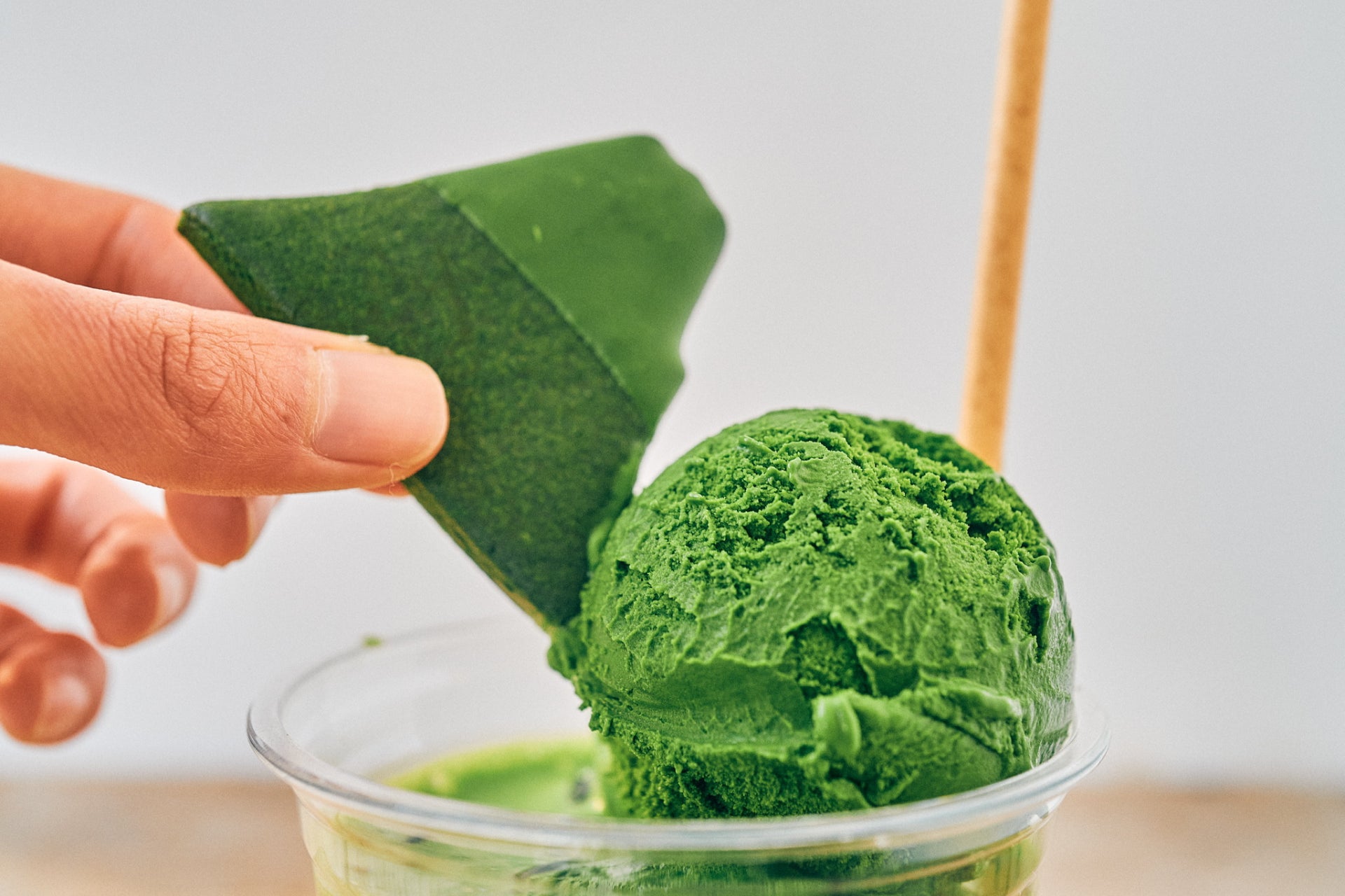 「富士抹茶クッキー」はドリンクにもトッピング可能です。アイスクリームにディップしてお召しがりください。