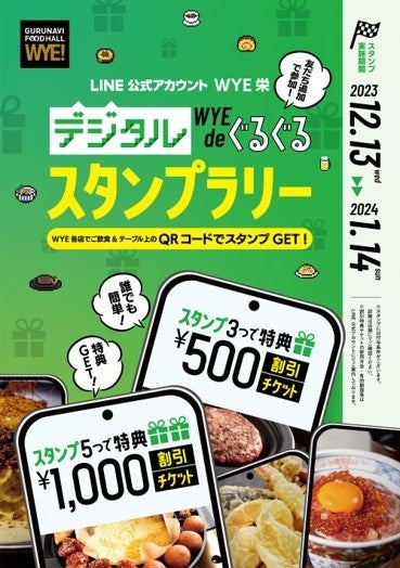 また、オープン日から開催するデジタルスタンプラリー「WYE de ぐるぐる デジタルスタンプラリーキャンペーン」は、GURUNAVI FOODHALL WYE 栄の全飲食店が対象となり、公式LINEアカウントをフォローし各店舗設置のQRコードを読み込むことでスタンプをゲット。スタンプの数に応じてクーポンをプレゼントします。この機会に、新店舗をはじめGURUNAVI FOODHALL WYE 栄ならではの飲食店ラインナップを様々なシーンでお楽しみください!