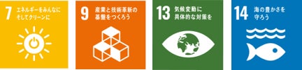 今回ご案内の取り組みは、SDGsの17のゴールのうち、特に7番、9番、13番、14番に貢献するものと考えています。