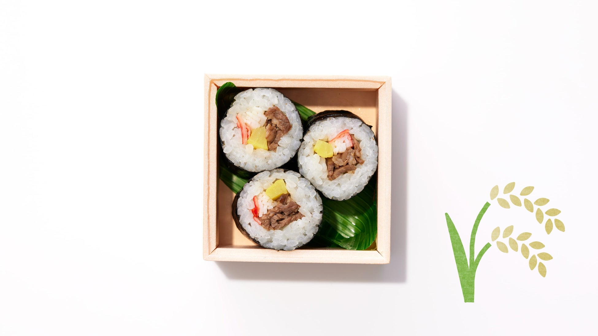 大粒で炊飯後も味がしっかりしている「とちぎの星」に、牛肉やたくあんなどを混ぜて巻いた、ごま油香る韓国風海苔巻き。