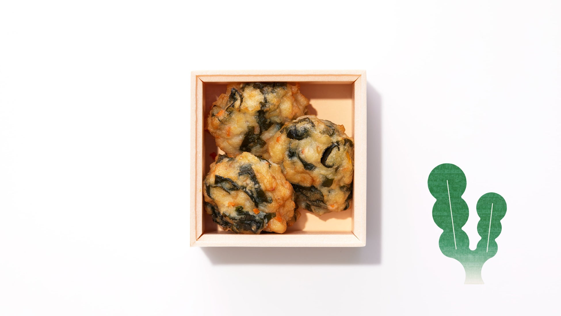 激流で育った、歯ごたえと風味が抜群の鳴門わかめに、たらのすり身を混ぜて団子状に。仕上げに色よく揚げた一品。