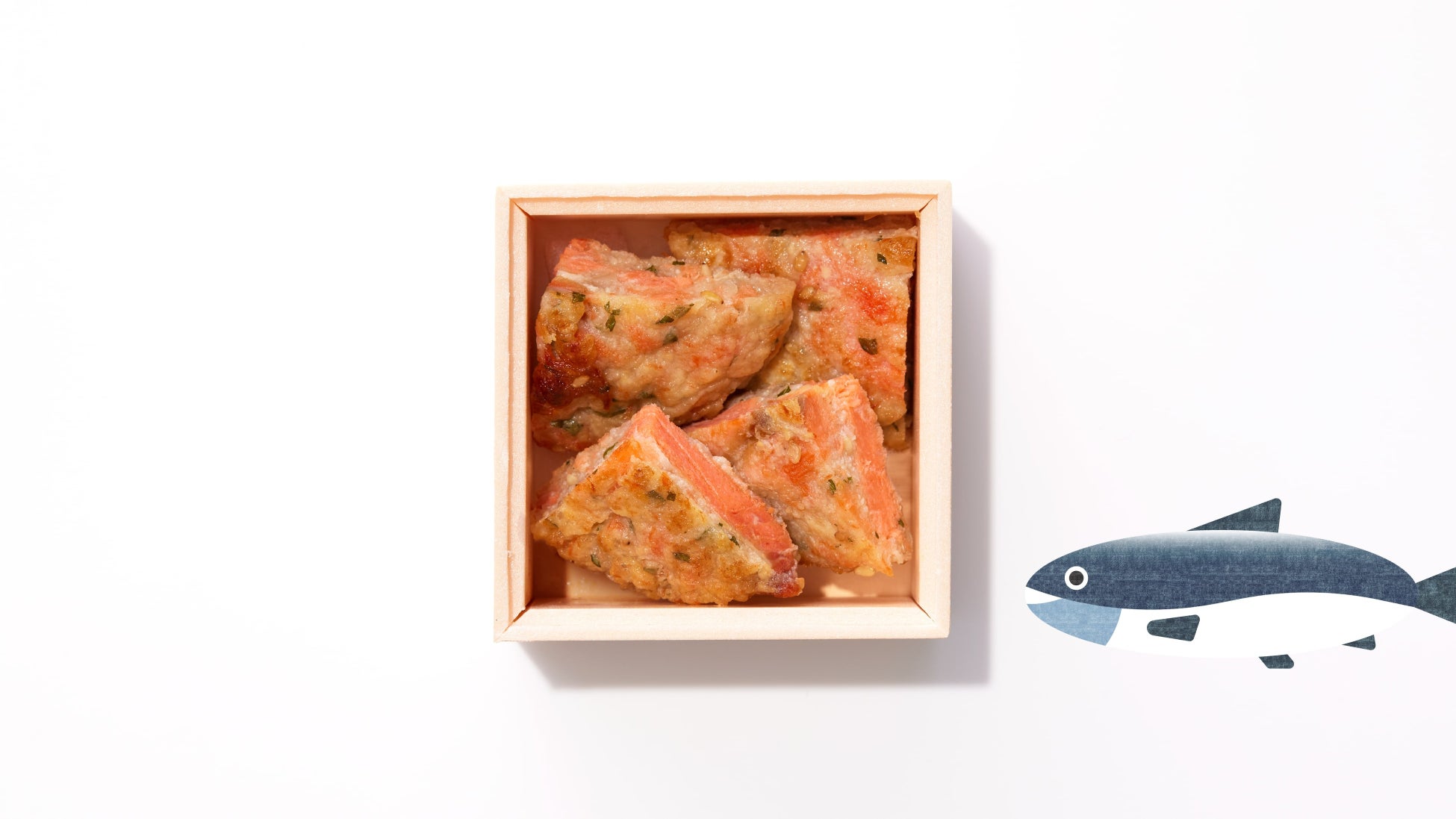 新潟の冷たい風の中で熟成し、旨みを凝縮した塩引き鮭を一口大にカットし、つぶした木綿豆腐を混ぜて、つくねに。