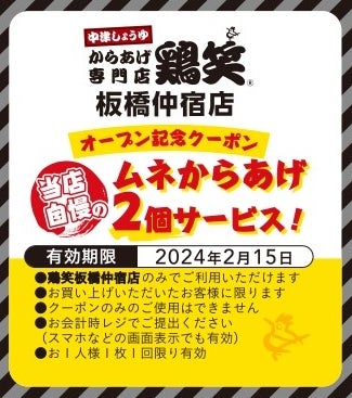 鶏笑 板橋仲宿店のオープンを記念して、板橋仲宿店限定で「ムネからあげ2個」がもらえるクーポン券を、数量限定で店頭などでお配りしています。以下のクーポン画像をスマートフォン等でご提示いただいても有効です。皆様のご来店をお待ちしております!
