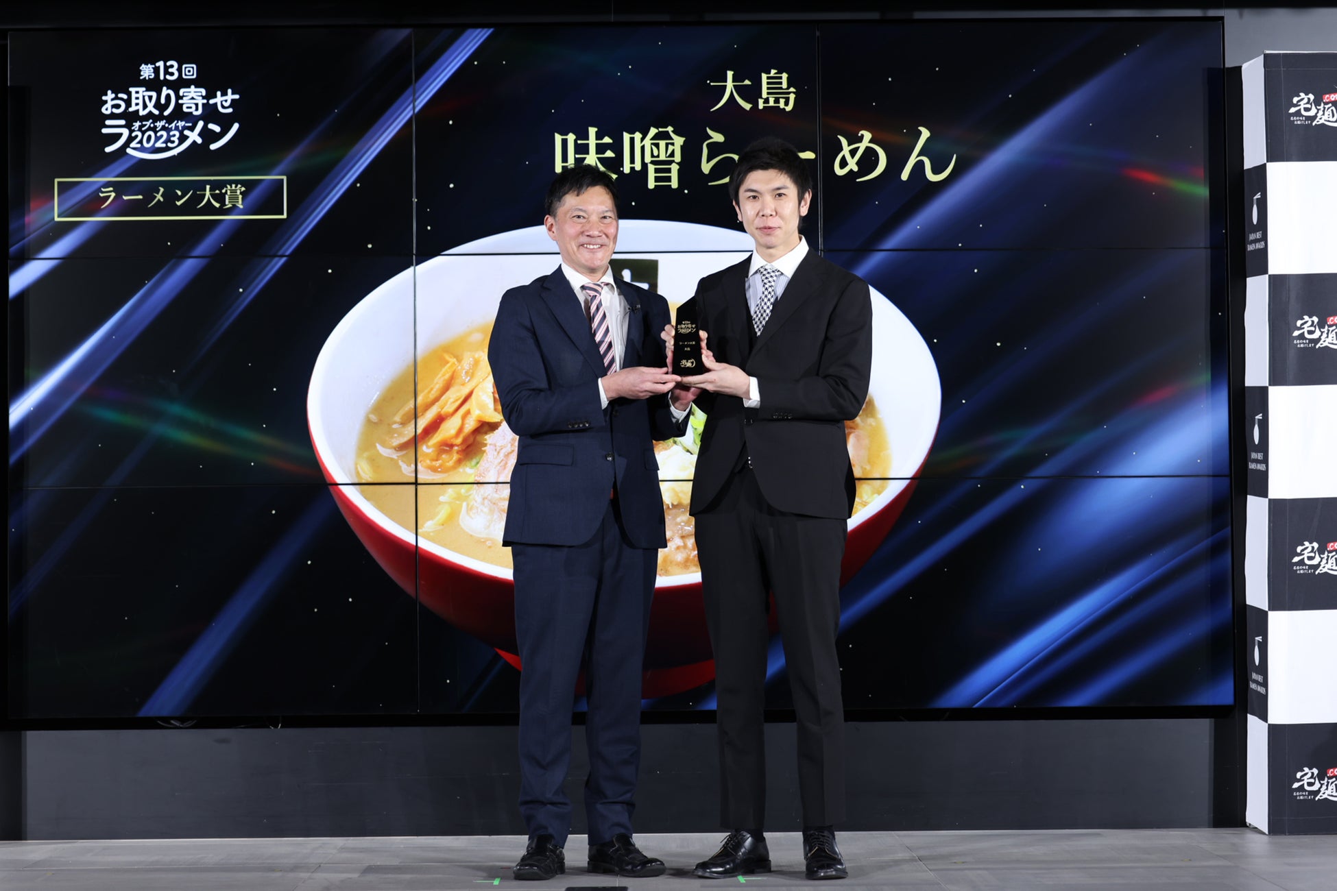 ラーメン大賞は、「大島」(東京都江戸川区)の「味噌らーめん」が受賞しました。味噌ラーメンがラーメン大賞を受賞したのは、第1回の開催以来、12年ぶりです。大島剛史店主は「思いもしない賞をいただけた。6年ほど宅麺への参加を断っていたが、野間口さんの熱意に負けて出品することにした。店とやり方が違う宅麺を始めたことによって新しい発見がたくさんあり、自分の味噌(ラーメン)の引き出しも広がった。この経験は、間違いなく店での営業にも還元されている。これからも一生懸命やっていきたい。」と振り返りました。