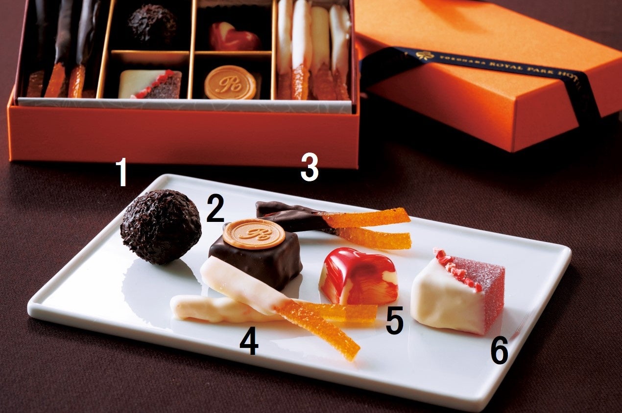オレンジ色のボックスでお届けする6種類のショコラは、ビターチョコレートまたはホワイトチョコレートを纏ったオランジェット、コニャックの風味が味わえるビタートリュフのほか、ほうじ茶やキャラメルのフレーバーなどをお楽しみいただけます。