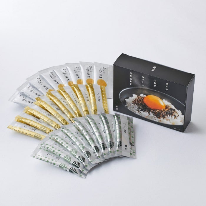 ↑B1東〈神宗〉卵かけご飯がおいしい詰め合わせ(卵かけご飯の醤油8g×8、つぶ昆2g×8、こな昆2g×8)税込864円