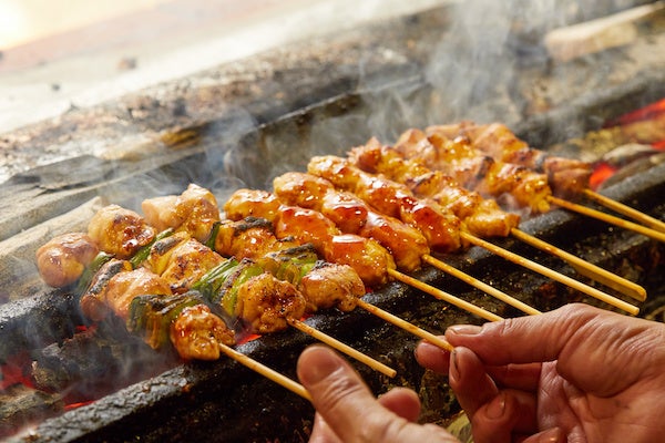 ↑B1東〈正起屋〉炭火焼 モモ串(1本)税込216円、炭火焼 モモネギ串(1本)税込194円、炭火焼 つくね串(1本)税込162円