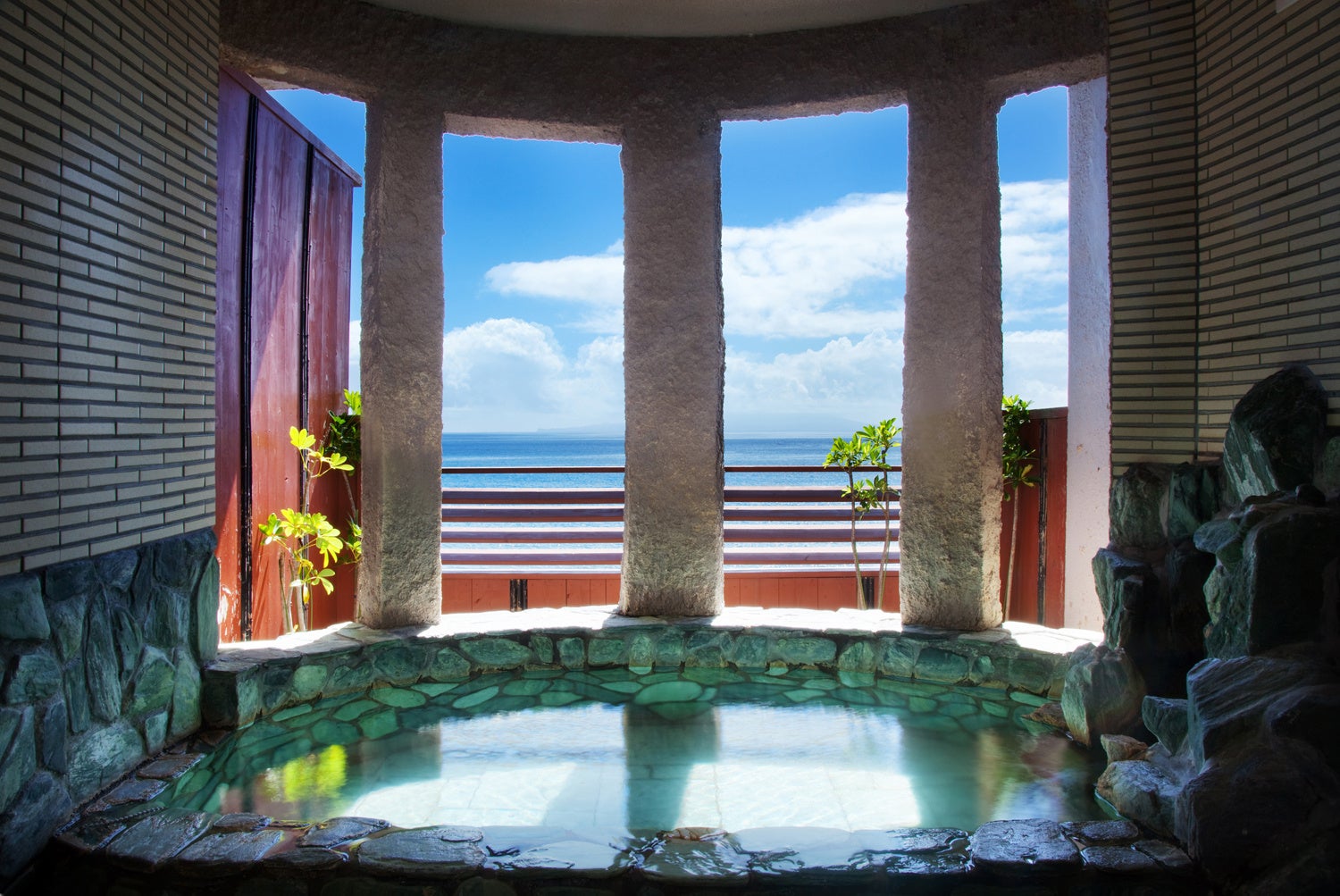 どこか懐かしい静かな港町、北川温泉の海沿いに佇み、海と伊豆大島のパノラマが広がる和の湯宿。自家源泉かけ流しの湯、伊豆山海の幸を味わう揚げたて天婦羅食べ放題の会席料理、海に昇る朝日と満月の夜には「ムーンロード」を望む客室で、ゆったりとお寛ぎください。湯上りビールやところてんサービス、温泉卓球、記念日のお祝い、連泊には吉祥弁当のランチ特典など、無料のおもてなしも好評です。伊豆熱川駅から定時無料送迎で10分。