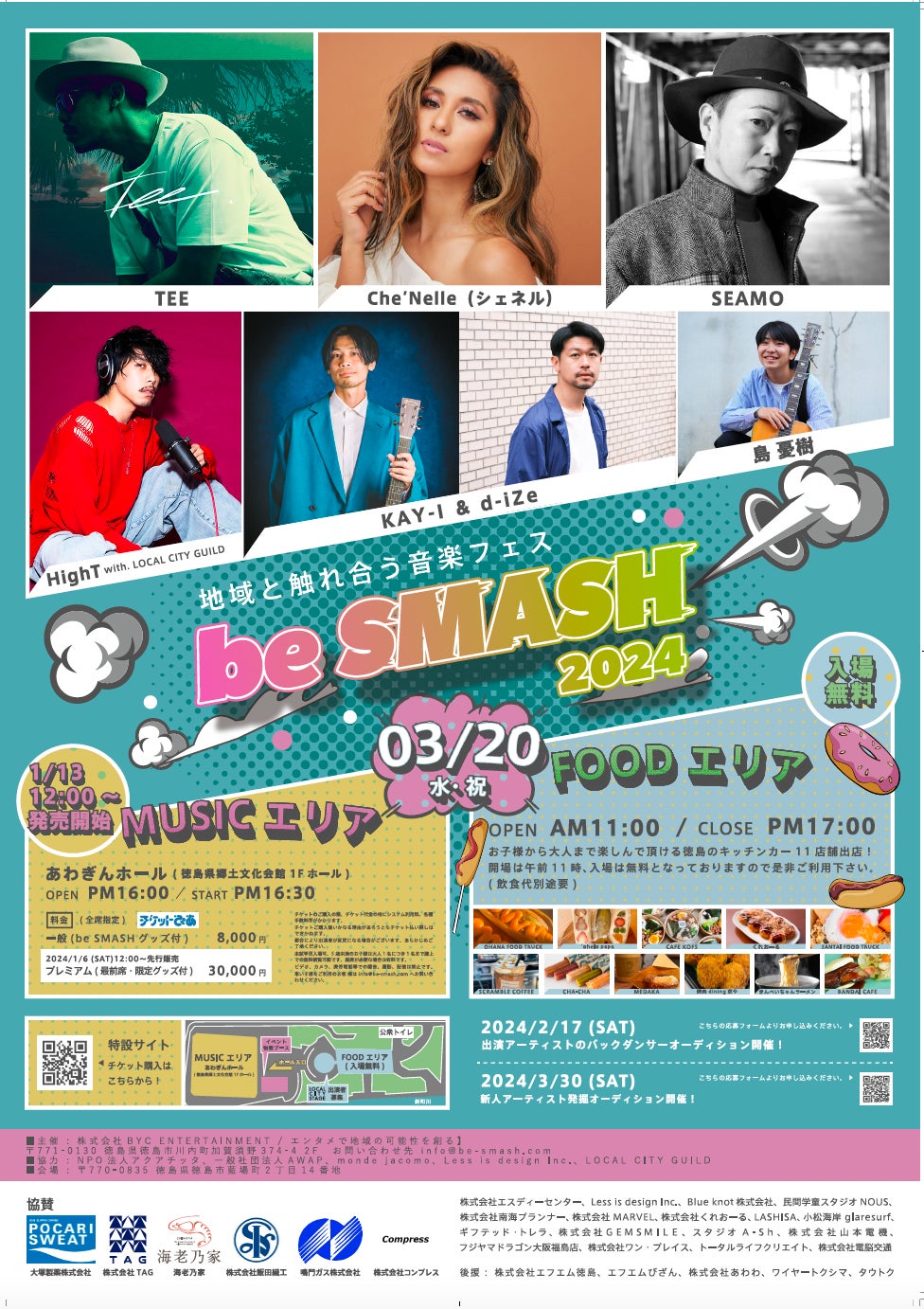 株式会社BYC ENTERTAINMENT(本社:徳島県徳島市 代表取締役社長:山岡隼人【HighT】以下ビーワイシー)は、ビーワイシーが掲げるプロジェクト「 LOCAL CITY GUILD」企画による徳島で音楽を楽しみ、徳島のアーティストの機会作りを提案するイベント『beSMASH2024』を、3月20日(祝)にあわぎんホールを中心にした有料ミュージックエリアと藍場浜公園ご成婚広場のフードエリアを入場無料で開催される。