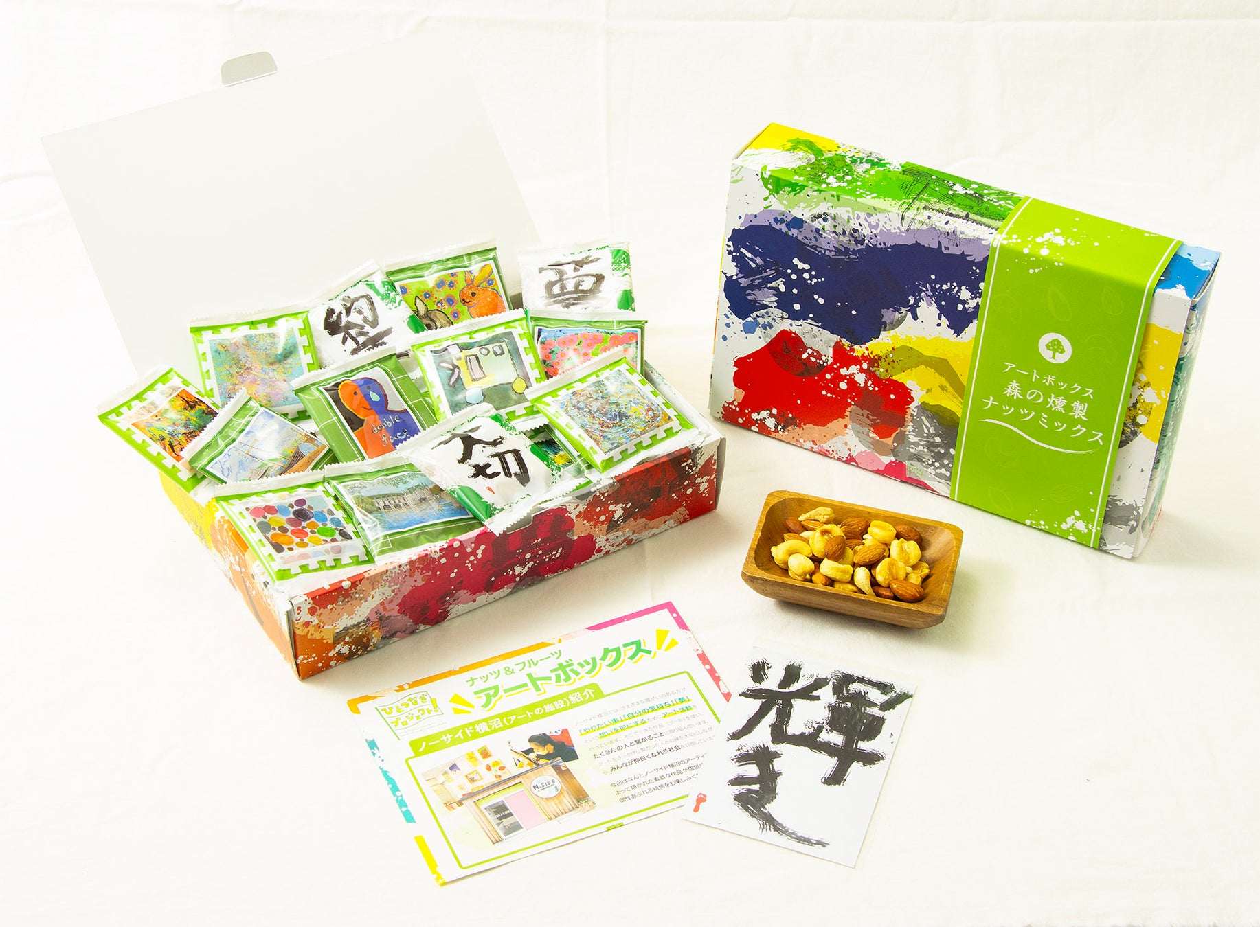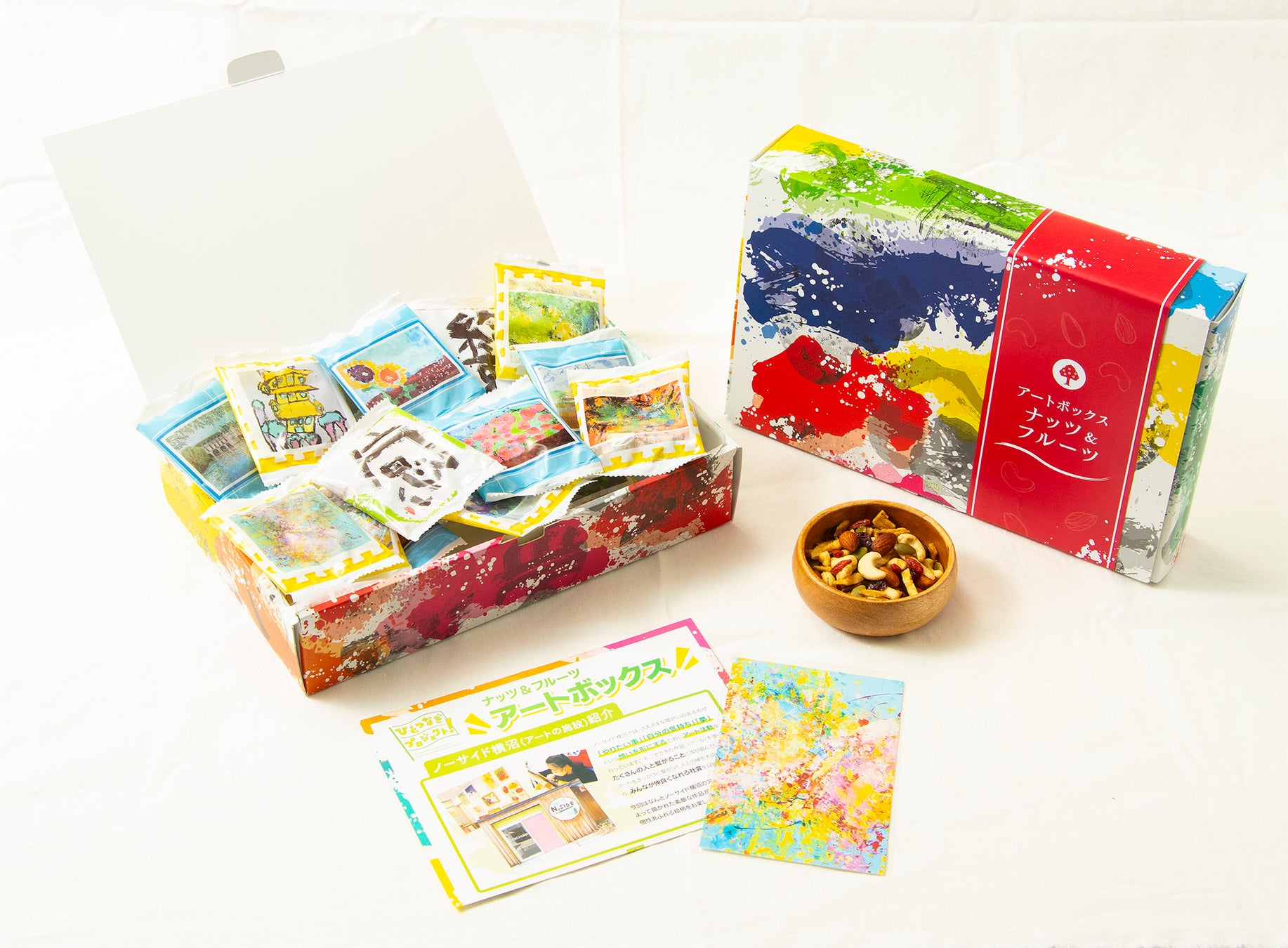 アーモンド、カシューナッツ、バナナスティック、ドライクランベリー、素焼きパンプキンシード、クコの実が入っています。またアート作品のポストカードが1枚入っています。