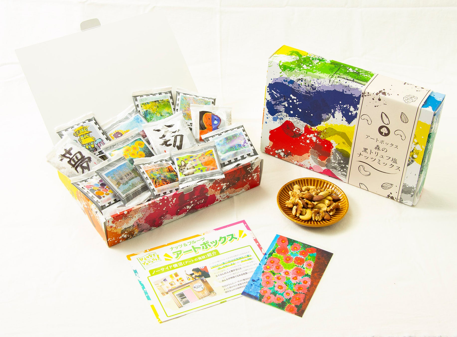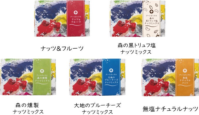 アートボックスコレクションは、「ナッツ&フルーツ」、「森の黒トリュフ塩ナッツミックス」、「大地のブルーチーズナッツミックス」、「森の燻製ナッツミックス」、「無塩ナチュラルナッツ」の5種類の味が楽しめるラインナップをご用意いたしました。贈答用のギフトとして、また来客時のお茶請け用、普段のおやつなど様々なシーンでご利用頂けます。