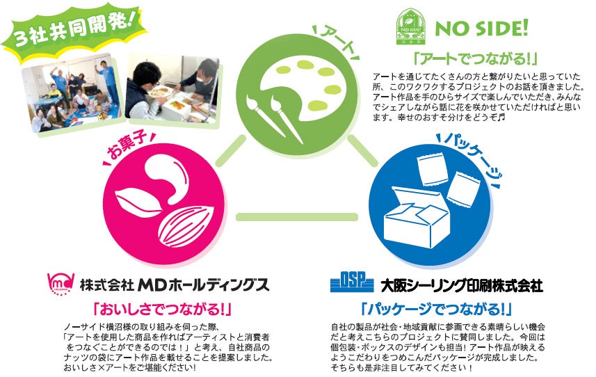 当社はノーサイドが立ち上げた「ひとつなぎプロジェクト」に賛同し、「ノーサイド横沼」で活動するアーティスト達を応援しています。これまでにアーティスト達が創作してきたアートとお菓子を組み合わせた「アートボックス」を共同で開発し販売してきました。お菓子を通して、ノーサイドのアート作品だけでなくその想いや様々な活動を多くの方に知ってもらい、たくさんの人とつながっていく「つながる社会」を目指しています。イオンモール株式会社が掲げる「開花メタバース」のコンセプトや想いに共感し、今回の出店に至りました。