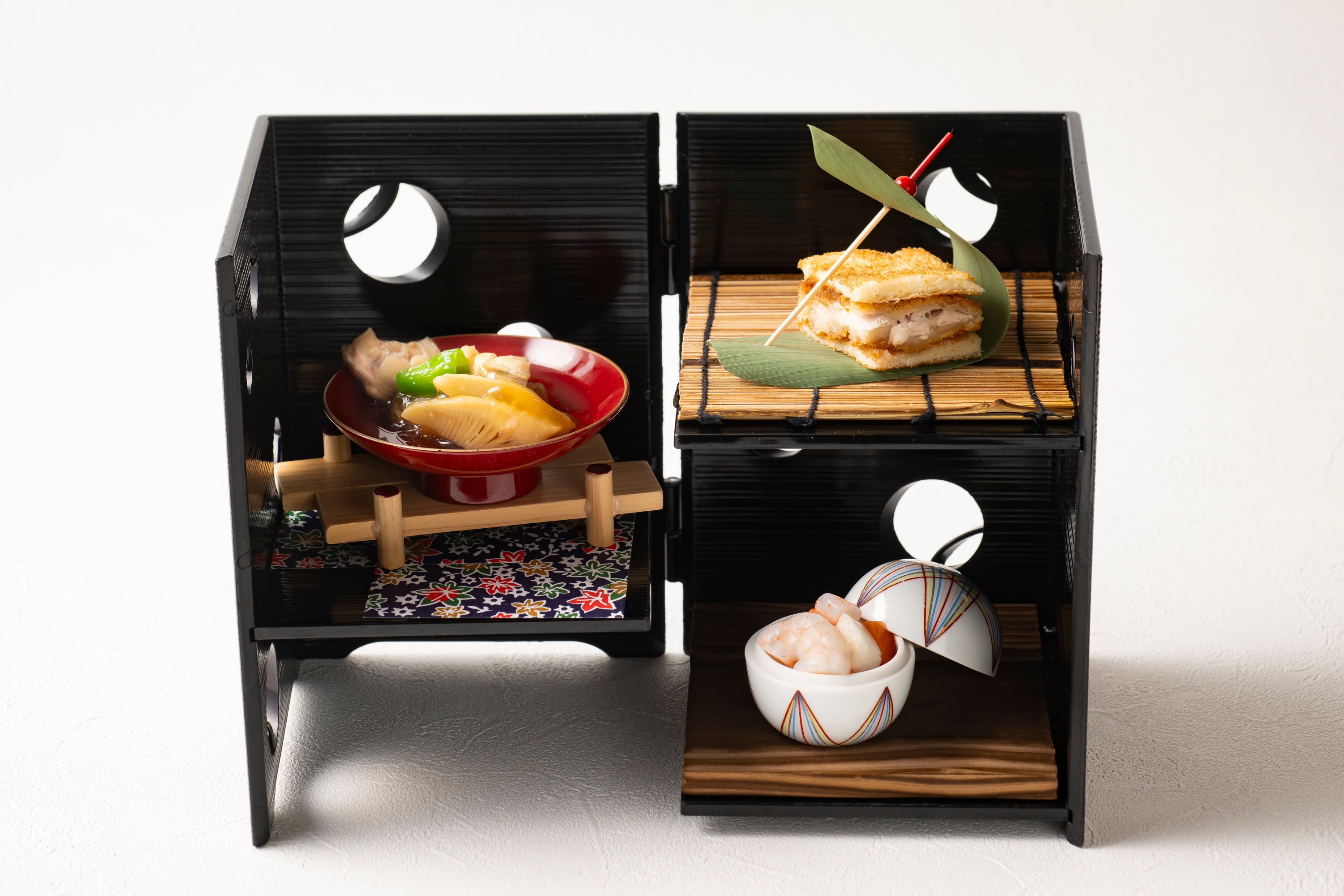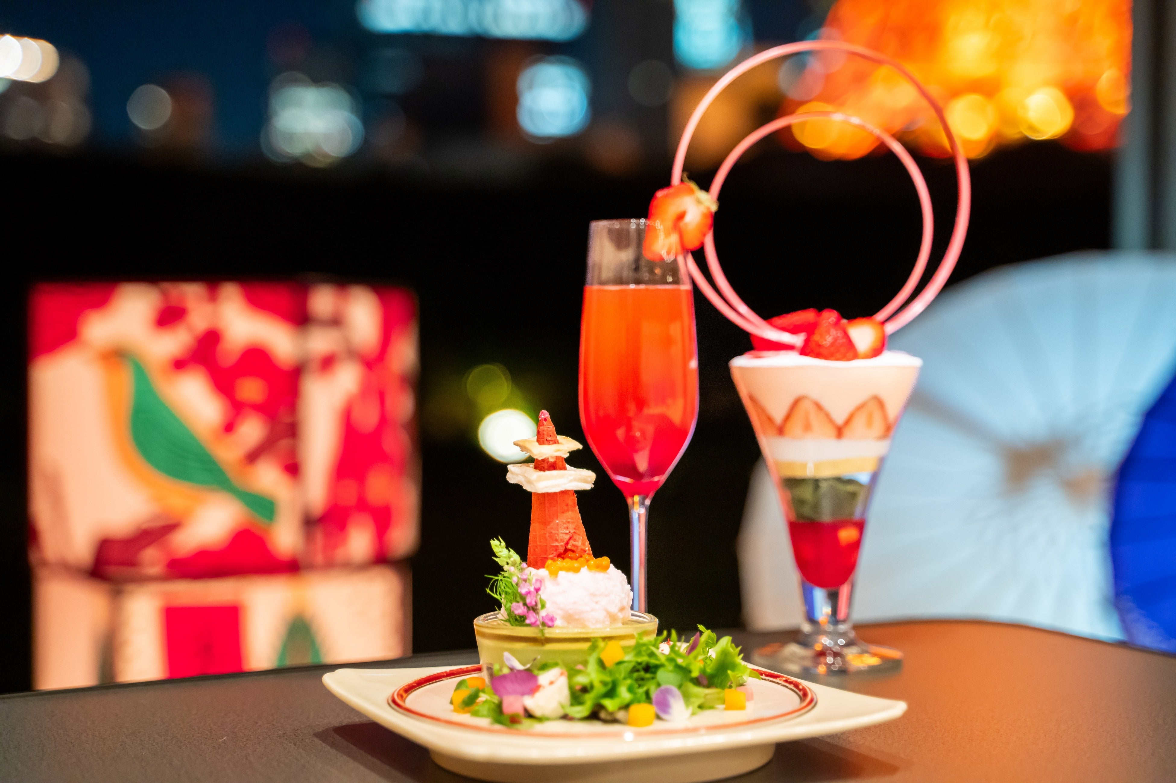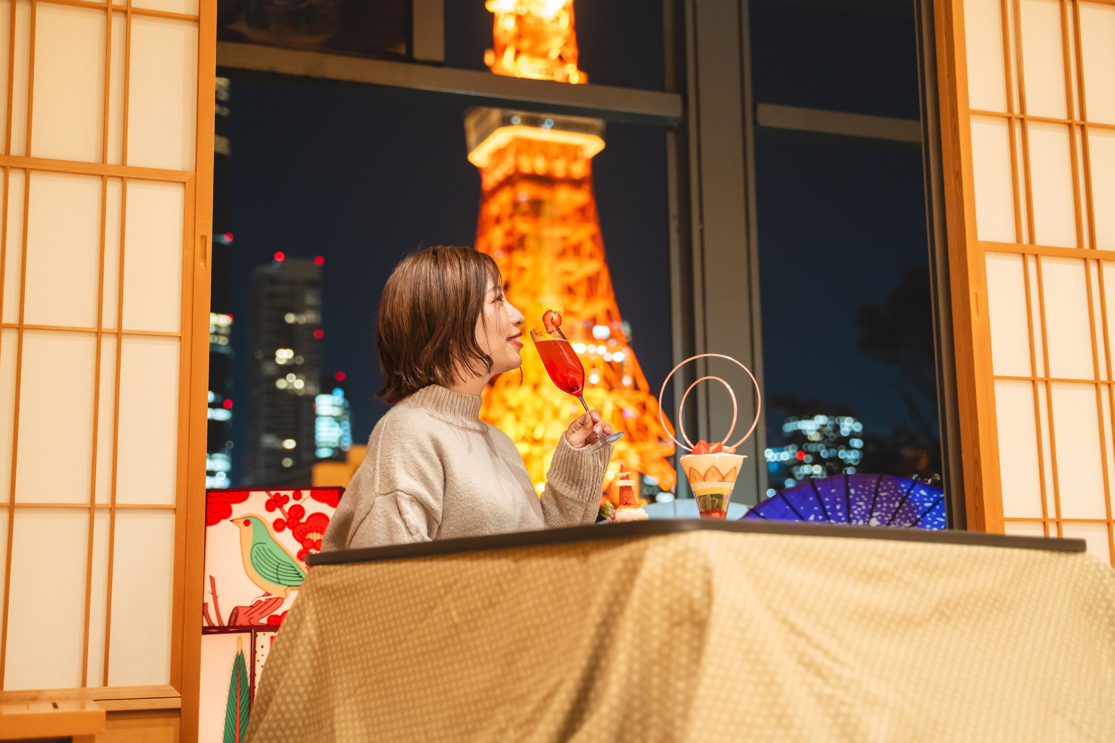 雨避けとしてだけではなく、お洒落や歌舞伎の小道具としても人々を魅了してきた和傘。四季と花鳥風月があしらわれ、日本特有のかるたとして親しまれる花札、そして畳とこたつとともに、和文化を感じる装飾で空間を演出いたしました。また、庭園にて東京タワーを背にお楽しみいただける和傘のフォトスポットには、2024年の強運カラー(※)を取り入れ、パワースポットとしても運気をお持ち帰りいただけます。お食事は、東京タワーに見立てた伊勢海老(国産)と海の幸の盛り合わせ(予約制)やポテトサラダ、ほっこりするおでんやねぎま汁などもご用意。締めには、芝公園の緑と東京タワーの赤で仕上げた旬のいちごのパフェでスイーツまでお楽しみいただけます。