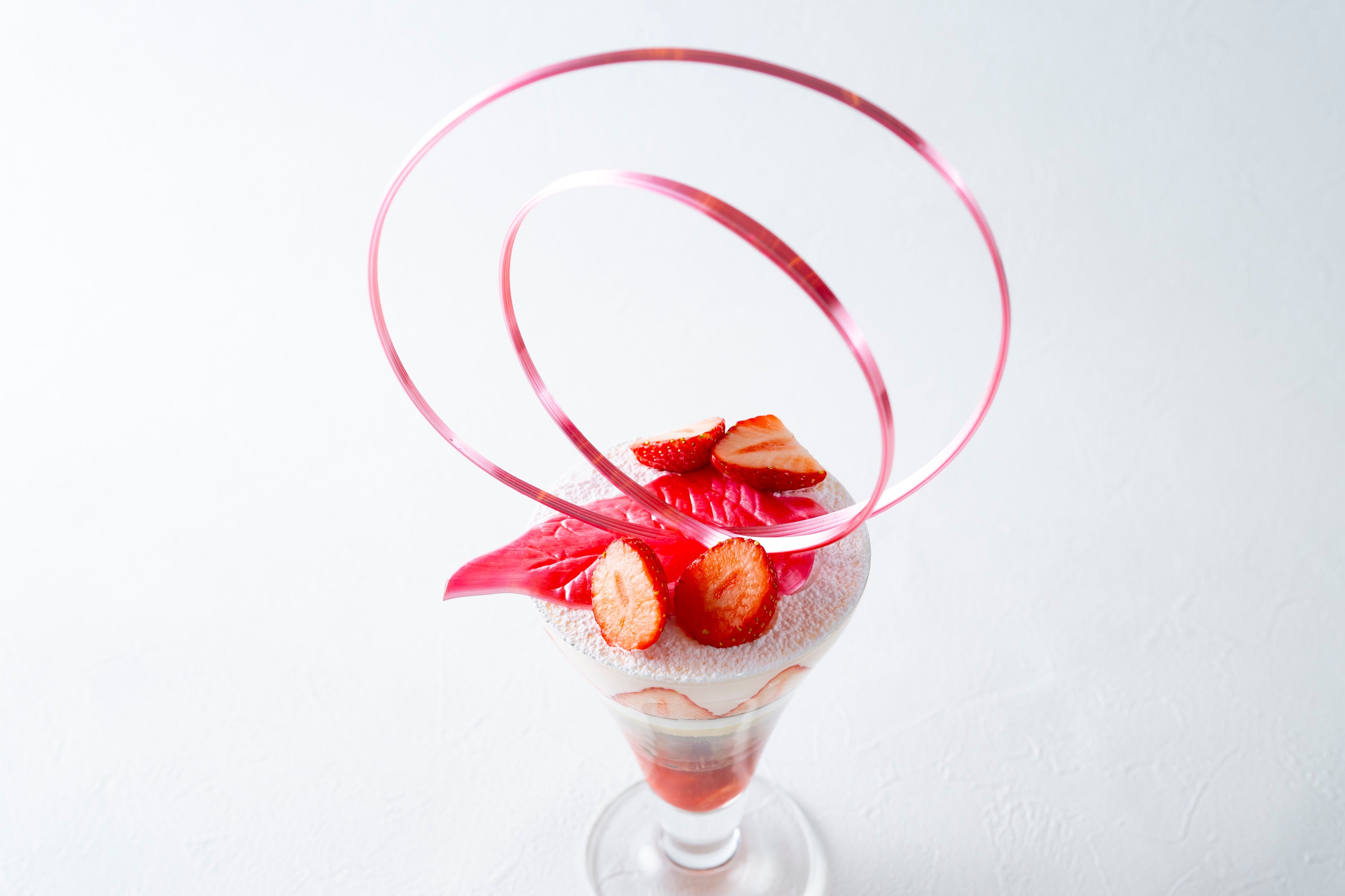 芝公園の緑と東京タワーの赤で仕上げたいちごのパフェ。大きな飴細工の輪っかにお好きな絶景を入れて映え写真を!