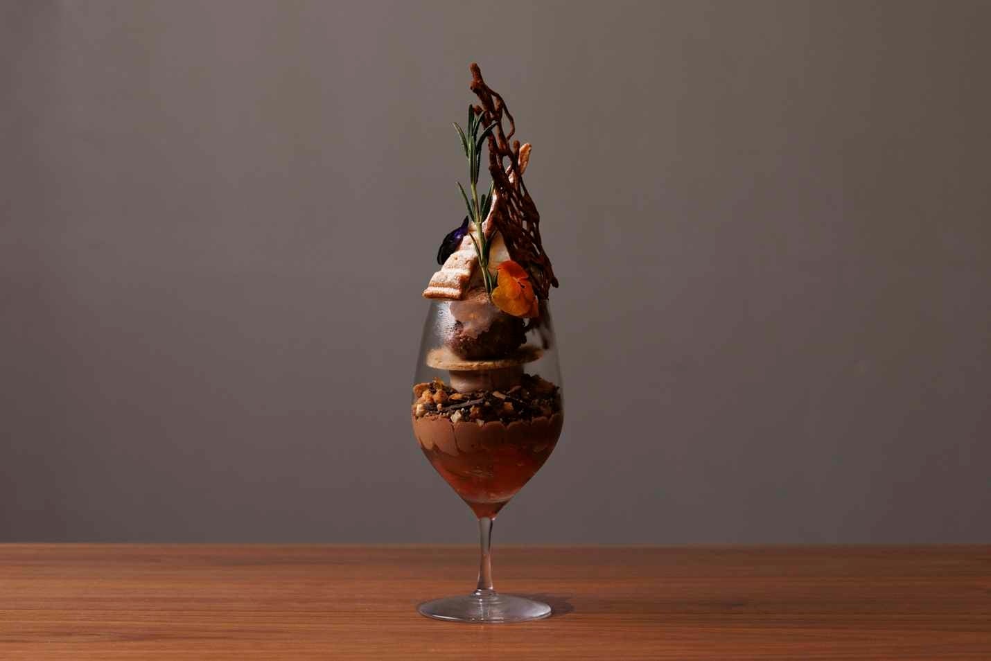 静岡を代表するフルーツである柑橘と相性の良いショコラのパフェ。チョコレートはビター・ミルク・ブロンドの3種を使用。ローズマリー・山椒などと組み合わせて香りにも奥ゆきを持たせています。