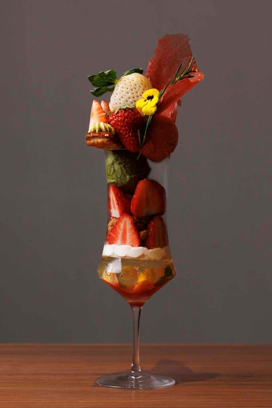 3種の苺を使い、苺を存分に味わっていただくパフェ。日本酒や大葉など和の食材も織り交ぜました。