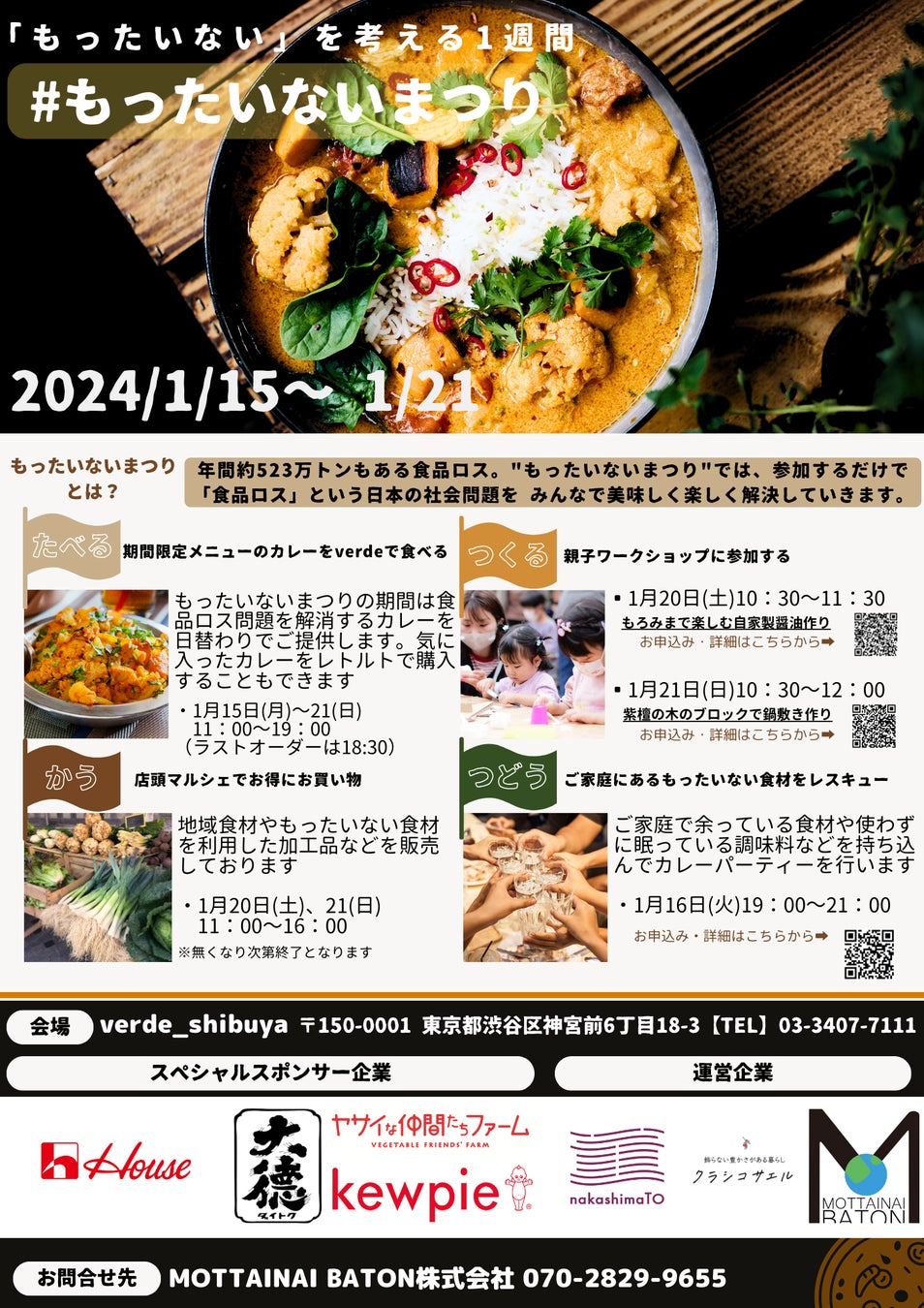 レトルトカレーにより食品ロス削減を図るMOTTAINAI BATON株式会社(本社:東京都国分寺市、代表取締役:目取眞 興明 めどるま こうめい、以下、モッタイナイバトン)は、2024年1月15日(月)から2024年1月21日(日)株式会社中島董商店が運営する野菜がメインの、彩り豊かなメニューを楽しめるカフェ「verde」にて『もったいないまつり@しぶや』を開催します。