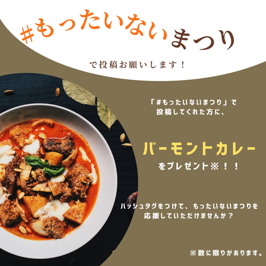 ハッシュタグキャンペーンとして、#もったいないまつり をつけて食品ロスをなくすためのアクションをSNS(X (旧Twitter)Instagram)で投稿してくれた方でイベントに来場した方にはバーモントカレーをプレゼントします。