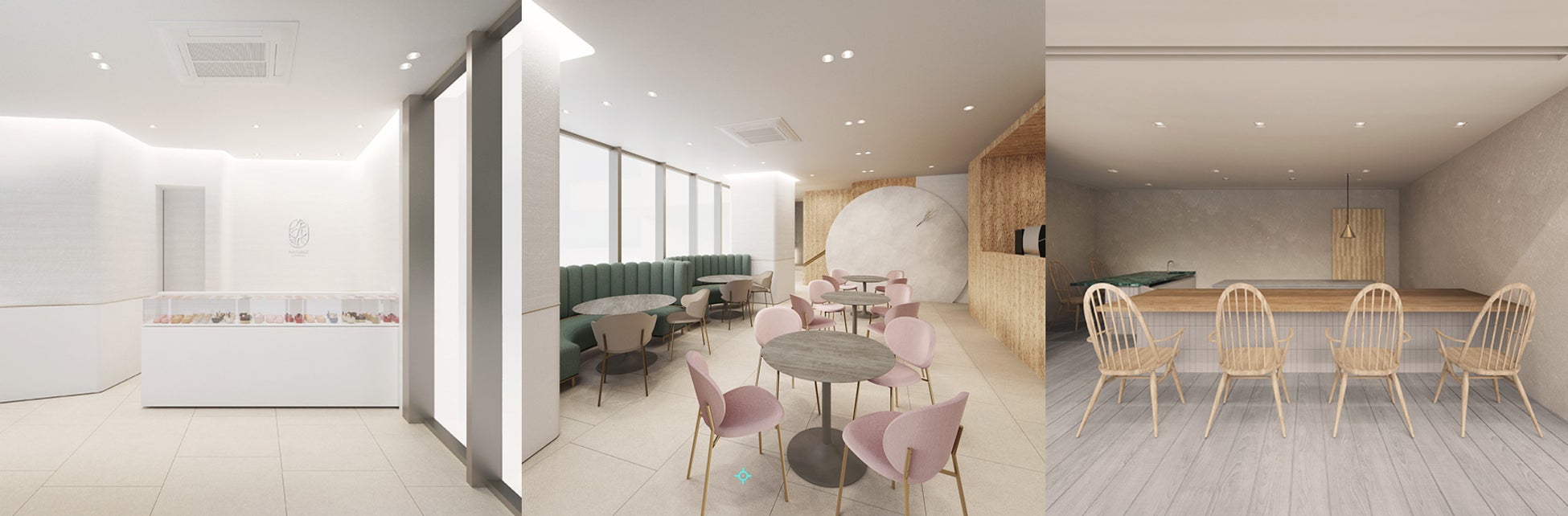 左から1F ブティック、1F サロン・ド・テ、2F シェフズテーブル