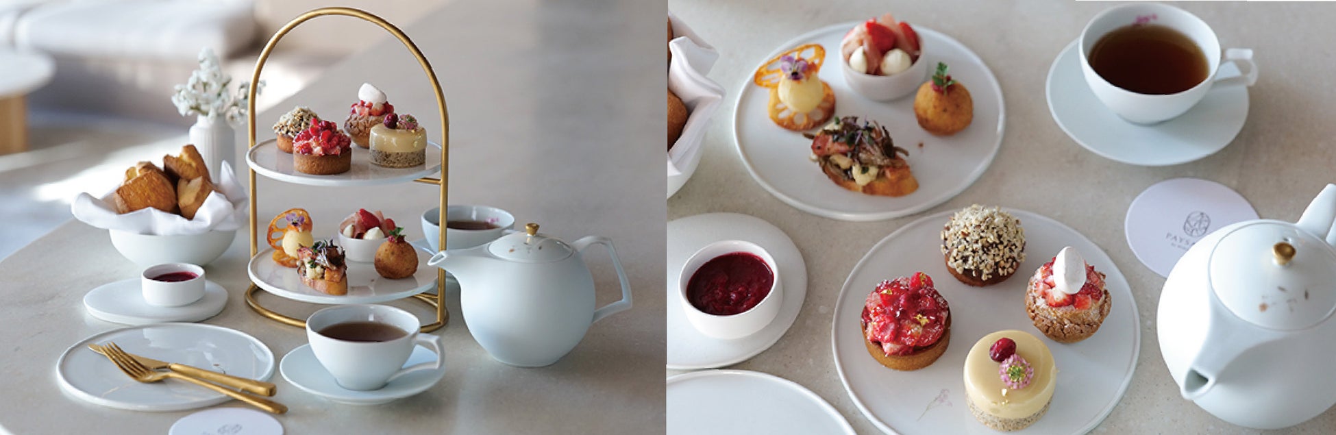 ブティックに併設する 1階サロン・ド・テでは、生産者と素材へのリスペクトを表現した、パティシエがひとつひとつ丁寧に作り上げるスイーツやセイボリーを、お楽しみいただけるアフタヌーンティー(7,500円税込)をご用意しております。オリジナルブレンドフレーバーティー「Garden(ガーデン)」をはじめとする、香り豊かな紅茶とともに、ゆったりとしたひと時をお過ごしください。テーブルに彩を添えるテーブルウェアには、佐賀県の窯元・李荘窯の寺内信二氏による有田焼食器を使用。PAYSAGE のシンボルであるボタニカル模様を施し、オープンに合わせてオリジナルで製作いたしました。