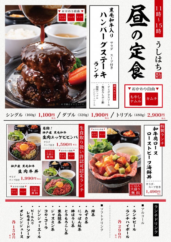 その他、サイドメニューやランチには「生肉牛丼」「ユッケビビンバ」など、うしはちでしか体験できない和牛の楽しみ方をご提案していきます。