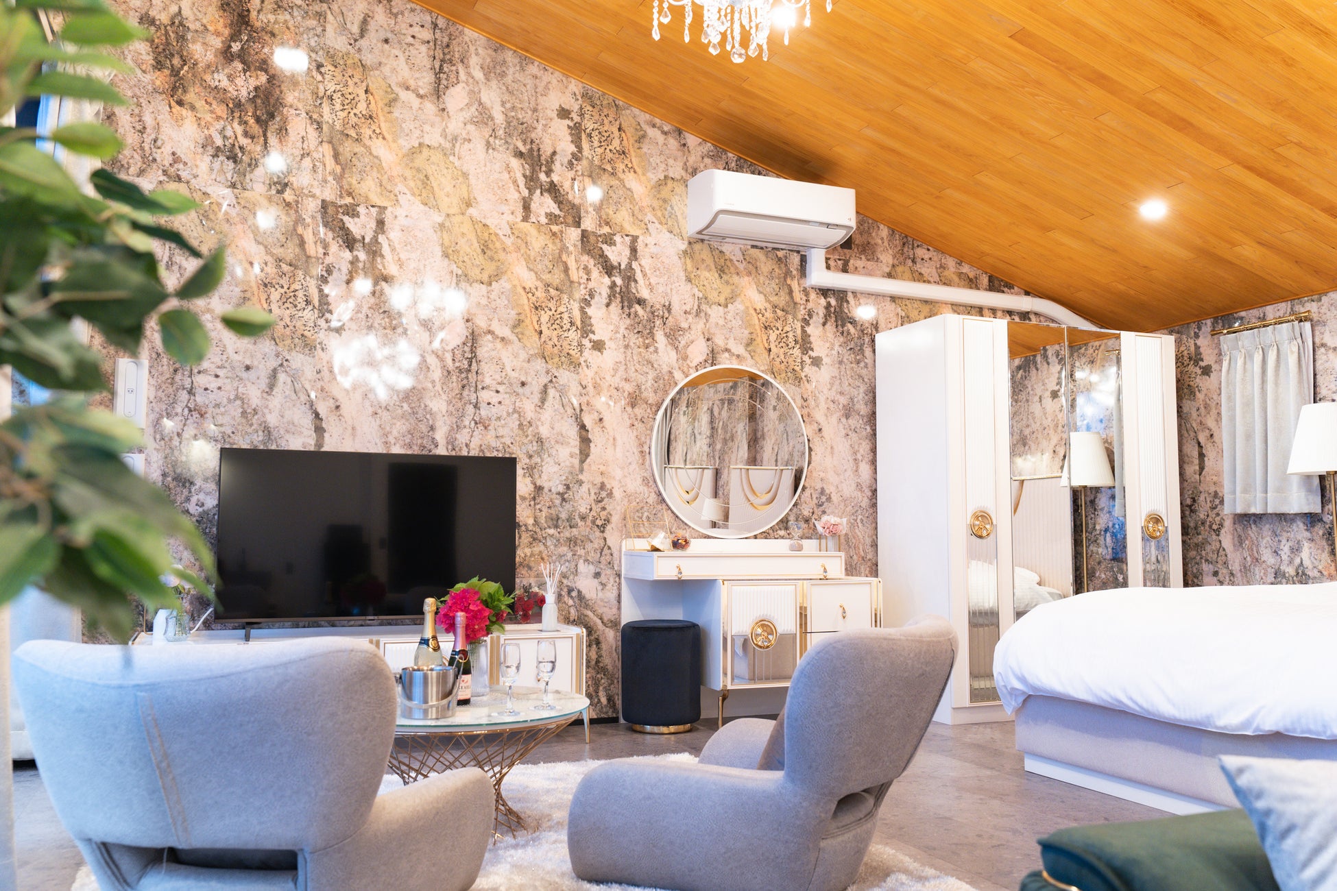 白とゴールドを基調とした豪華内装は、異世界で寛いでいる様な感覚を体験できます。