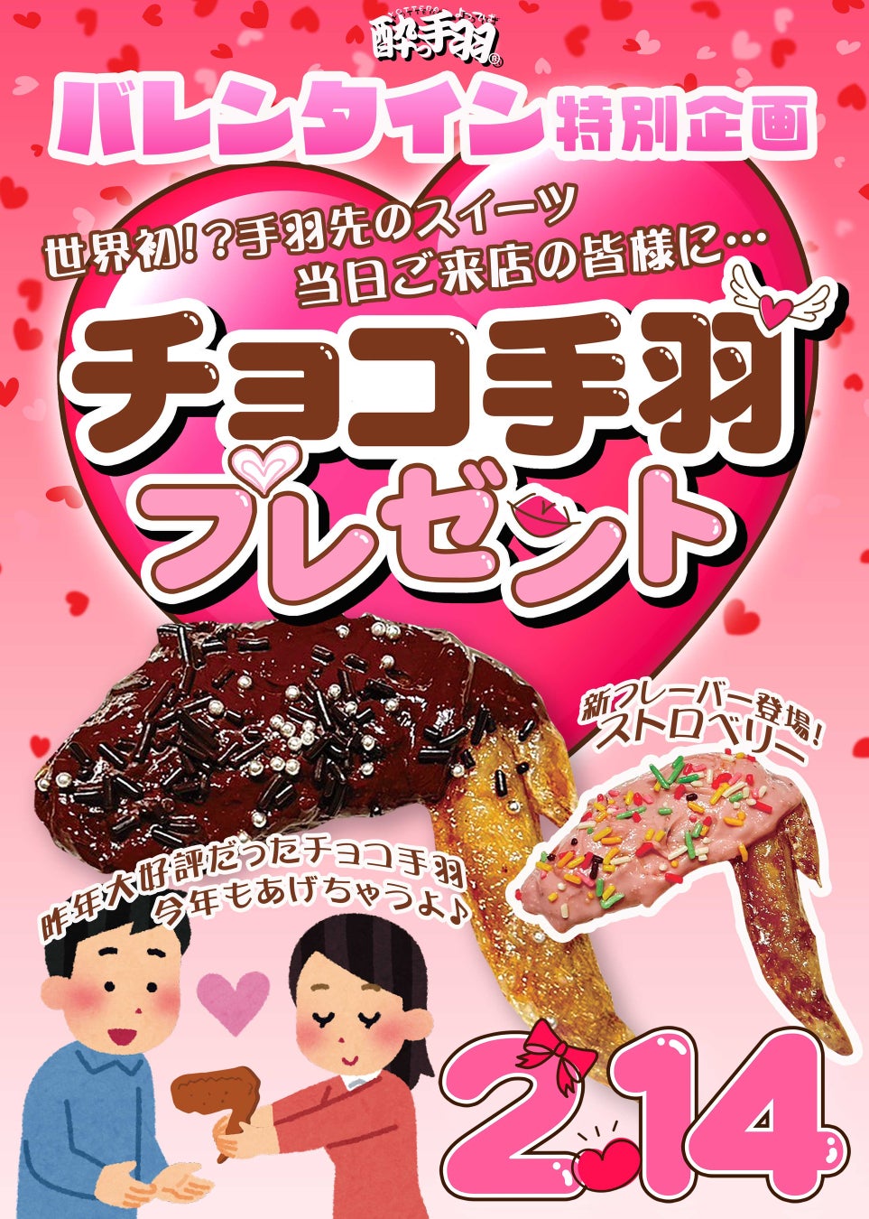 「チョコ手羽」は、看板メニューの手羽先をチョコレートでコーティングしてカラフルシュガーで仕上げる新感覚のスイーツ系手羽先です。昨年の大好評に気を良くして今年もプレゼントを実施。ビターなチョコレート味に加えて新フレーバーとしてストロベリー味もご用意いたします。酔っ手羽からの愛を込めたプレゼント、ぜひ受け取ってください。