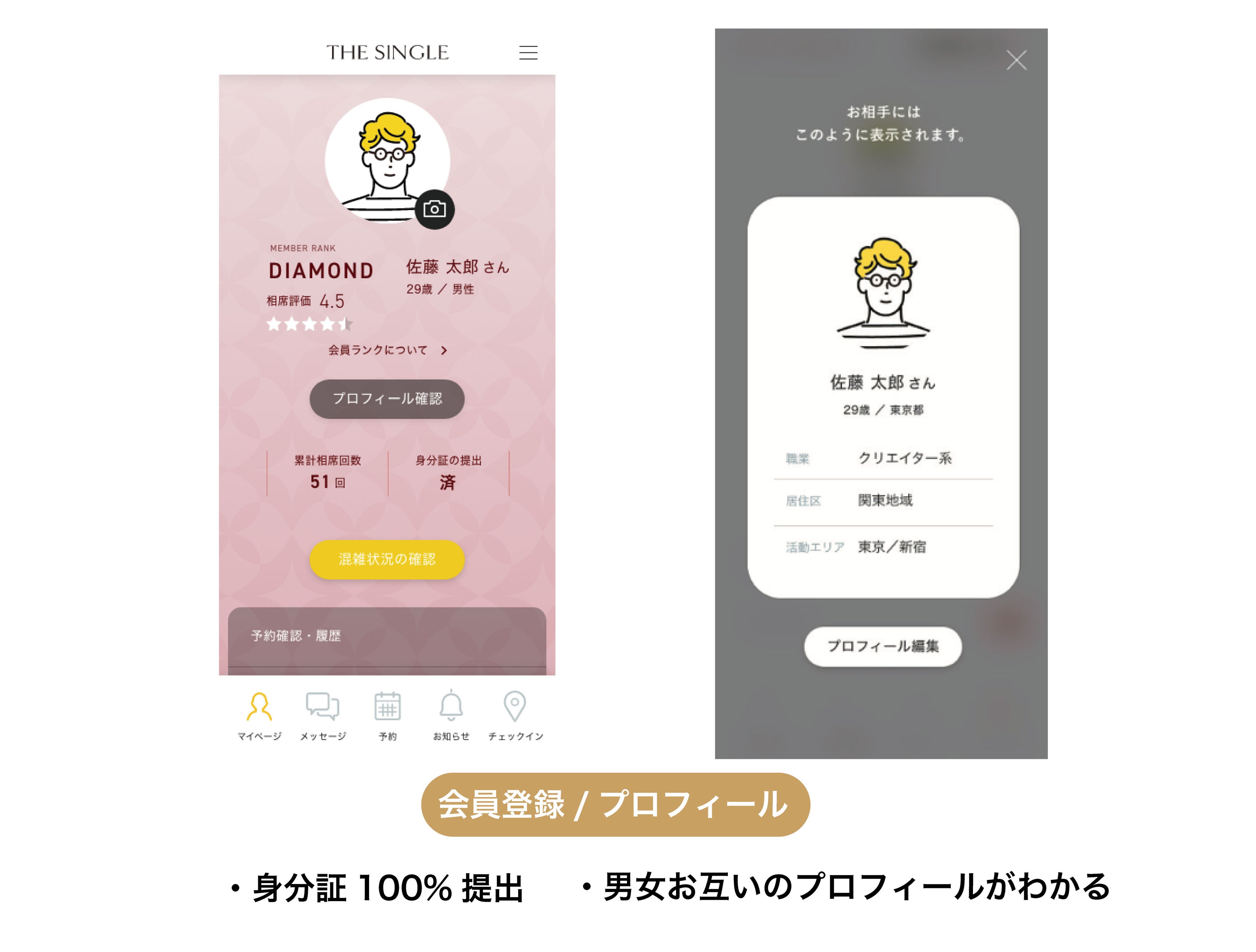 全てのお客様に会員登録(無料)をいただき、プロフィール、身分証明書を登録していただいた方のみご利用が可能となるため、安心・安全に相席いただけます。