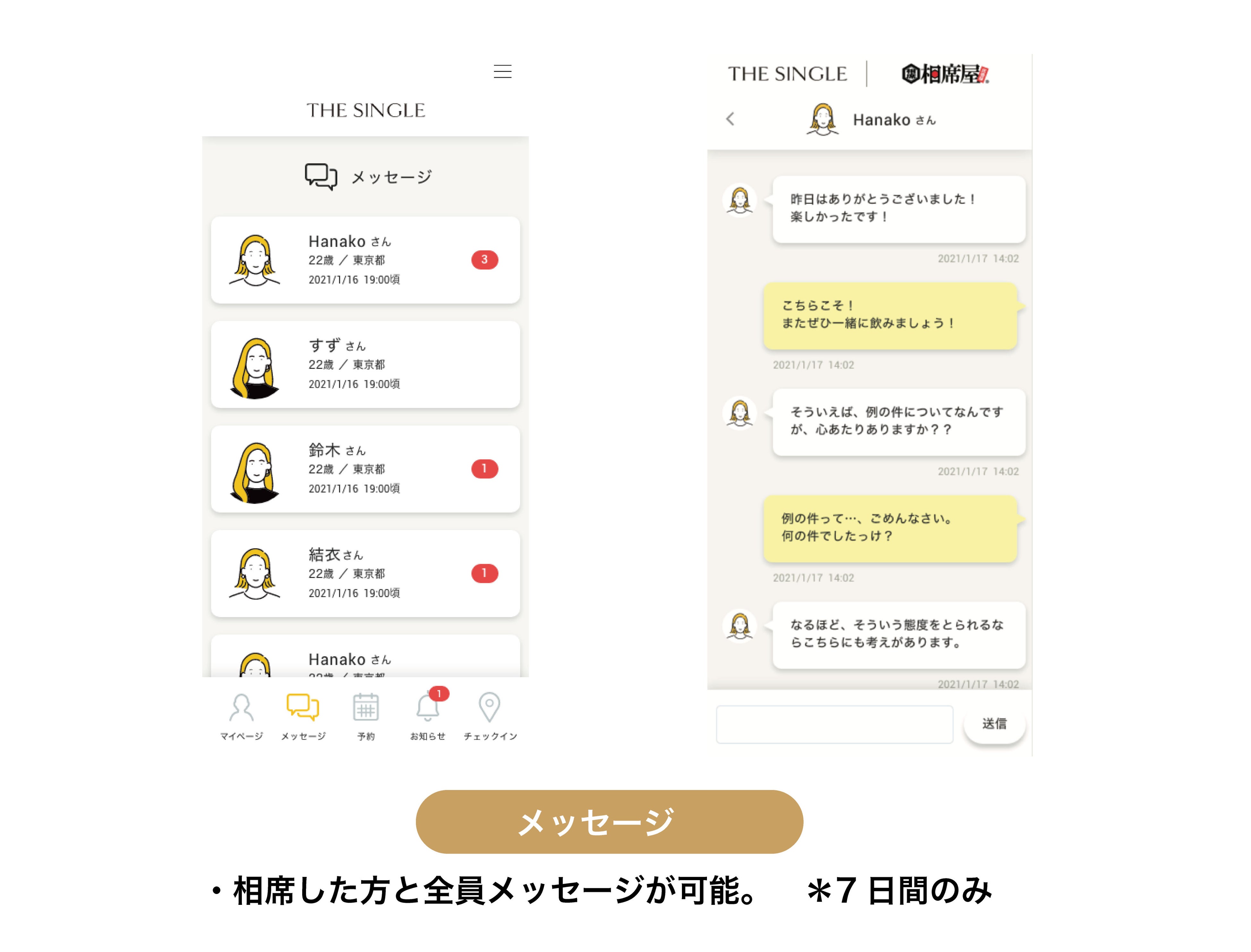 従来の相席屋や、他マッチングサービスでよくある「連絡先が聞けなかった」などのデメリットを解消すべくTHE SINGLEでは公式APPを通し相席したお相手とメッセージ機能で100%繋がることができます。
