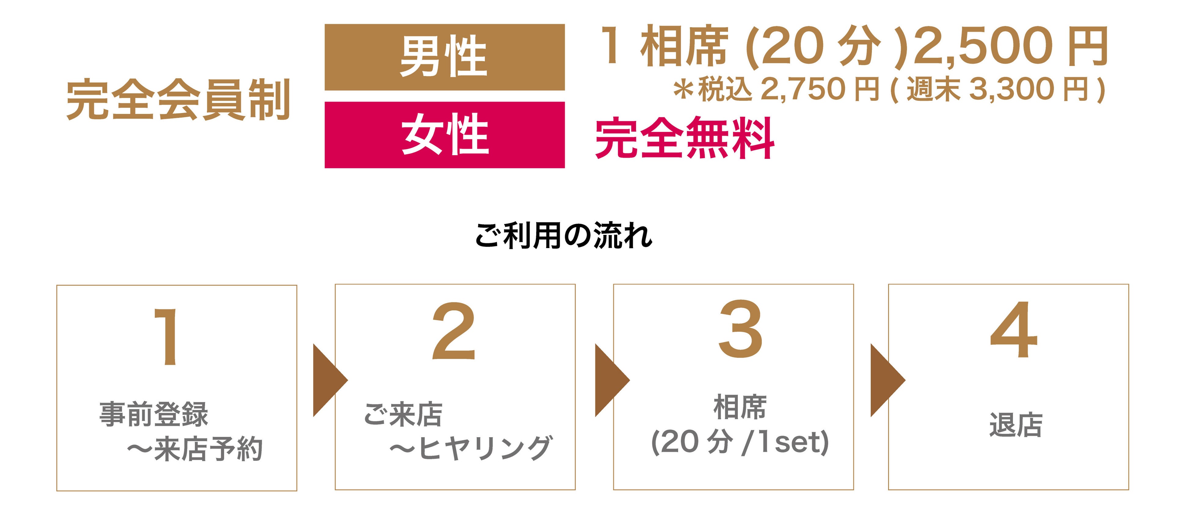 また、初めてご利用いただく男性のお客様へは無料体験プランをご用意し、相席2回(20分×2回)を相席1回分のご料金でご案内しております。
