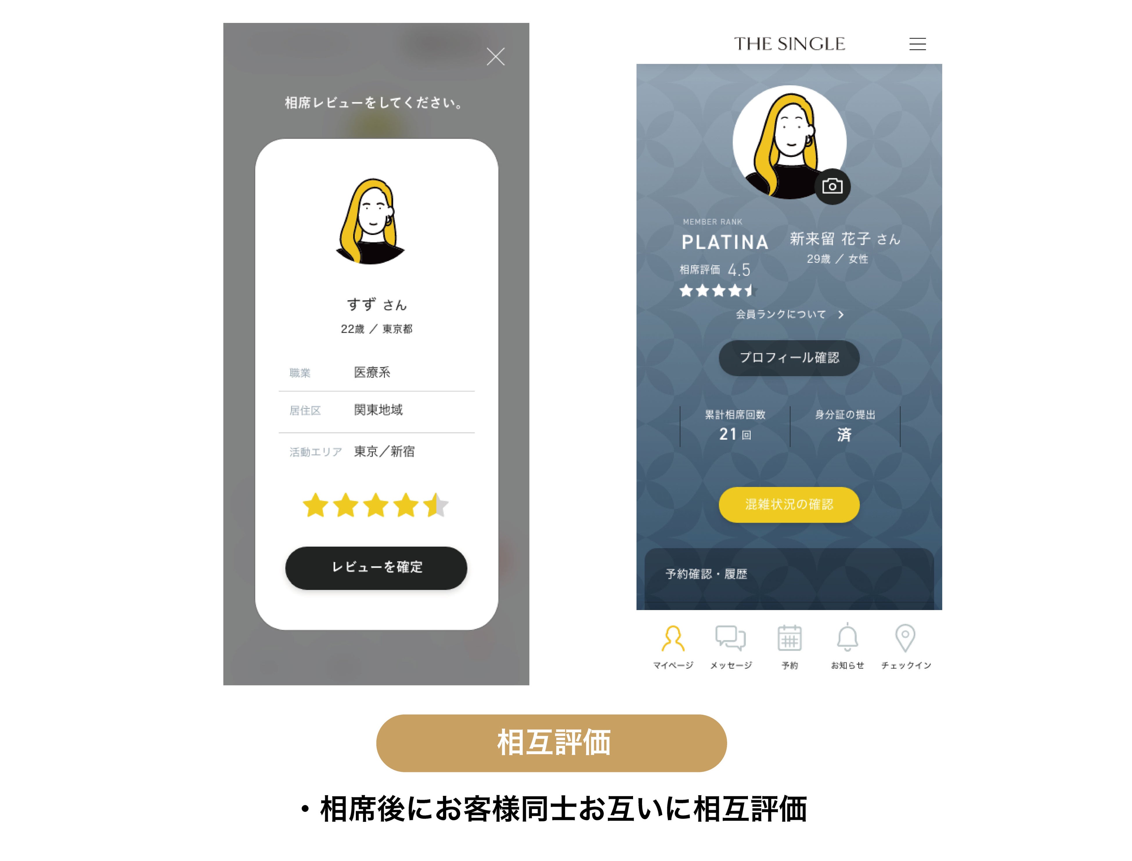 「THE SINGLE」は相互評価システムを採用。相席後は、お互いを評価し、評価されるため、相席の質の向上が期待されます。連続して低評価をされると強制退会になることもございます。*運営確認のもと強制退会へ移行。