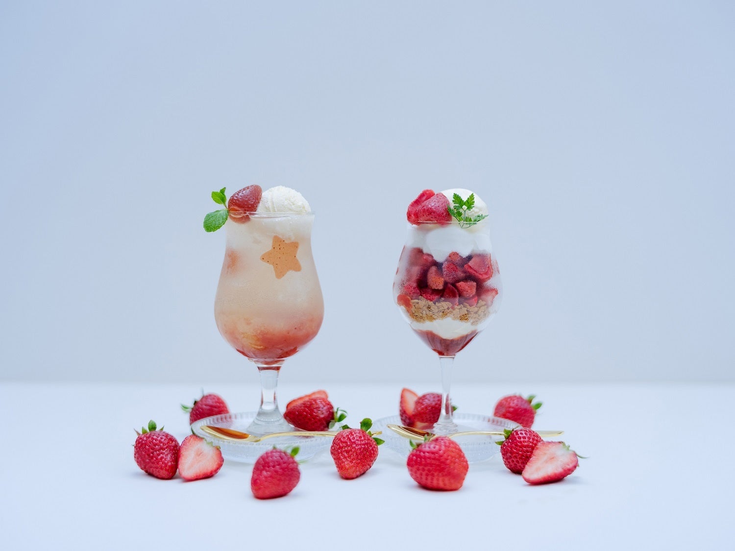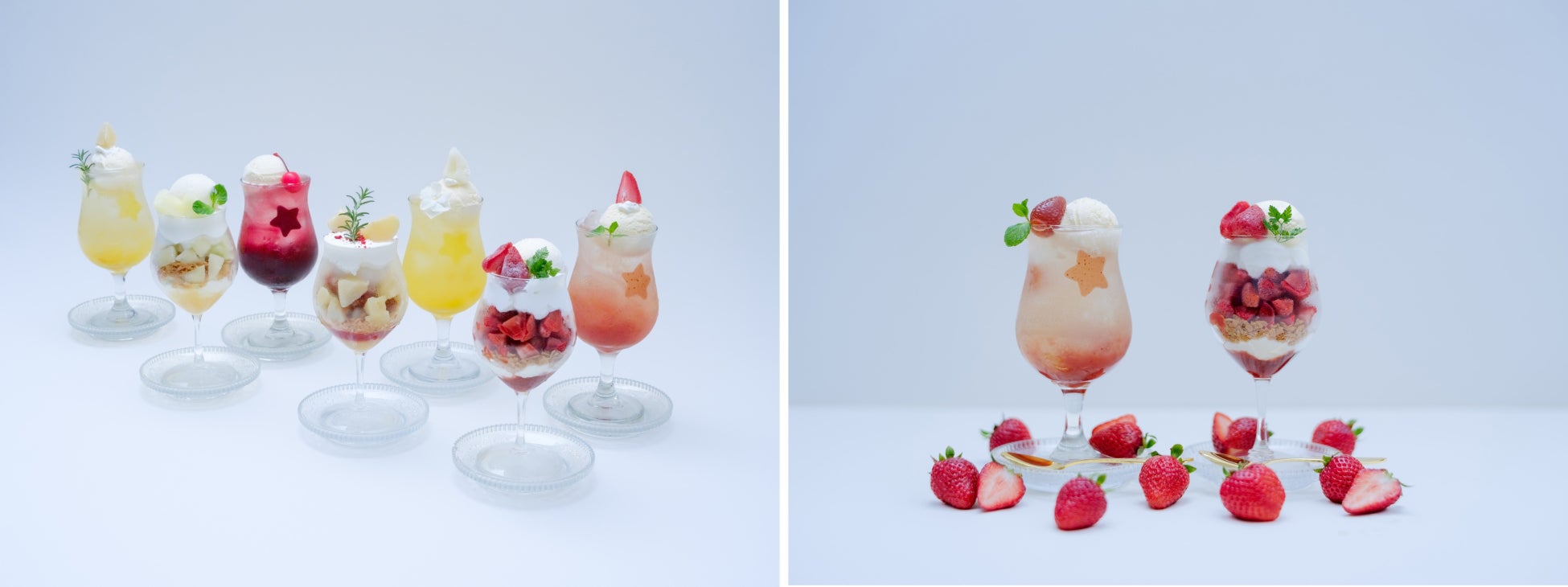 「フルーツとの新たな出会い」をテーマにクリームソーダ4つとパフェ3つの7種類を展開します。春を楽しめるいちごのクリームソーダといちごパフェがおすすめです。