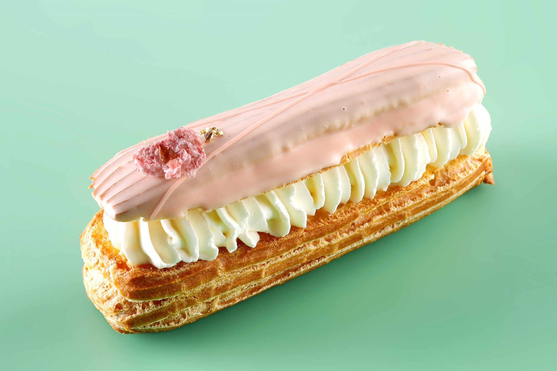 甘酸っぱいいちごとコクのあるピスタチオに上品な香味の桜を合わせました。パステルピンクのクリームや桜の花びらなどのデコレーションがキュートなエクレアです。