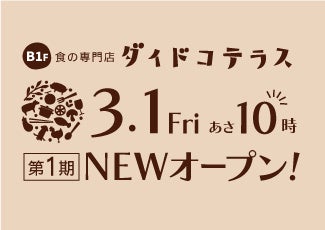 毎日の食卓を彩る食の専門店を集積したフロア。種類豊富な「おいしい」がつくられるダイドコロ。「おいしい」が集まり、くつろぎの場となるテラス。「おいしいもの」につられて一人ふたりと集まることで、新たなハッケンやオドロキを感じられるような場が、「ダイドコテラス」です。