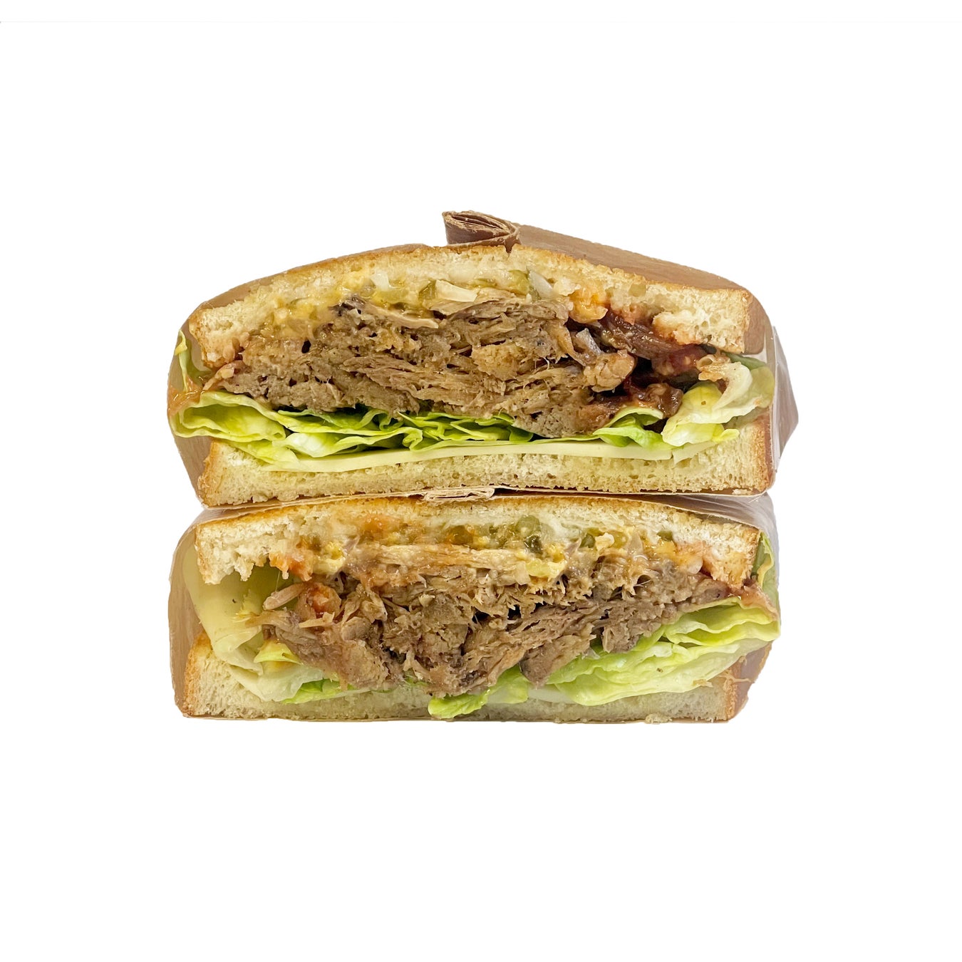 ジャークシーズニング(化学調味料不使用)のポークを長時間じっくり煮込みオリジナルBBQソースを使った、
